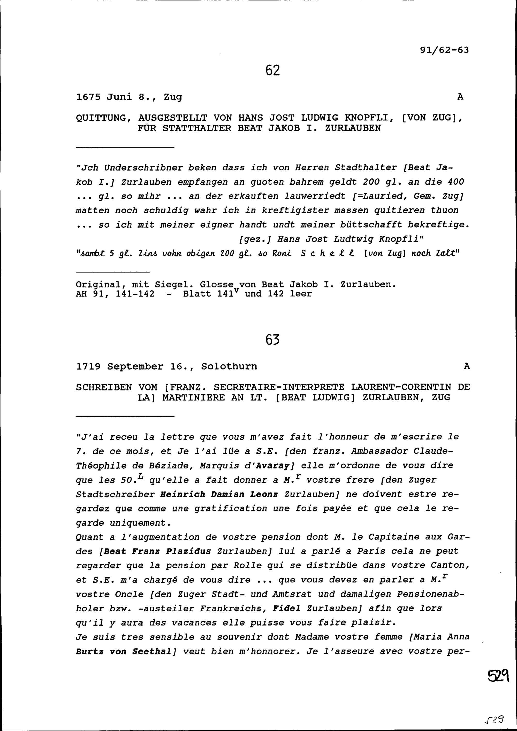 Quittung für Beat Jakob I. Zurlauben, Statthalter, ausgestellt von Hans Jost Ludwig...