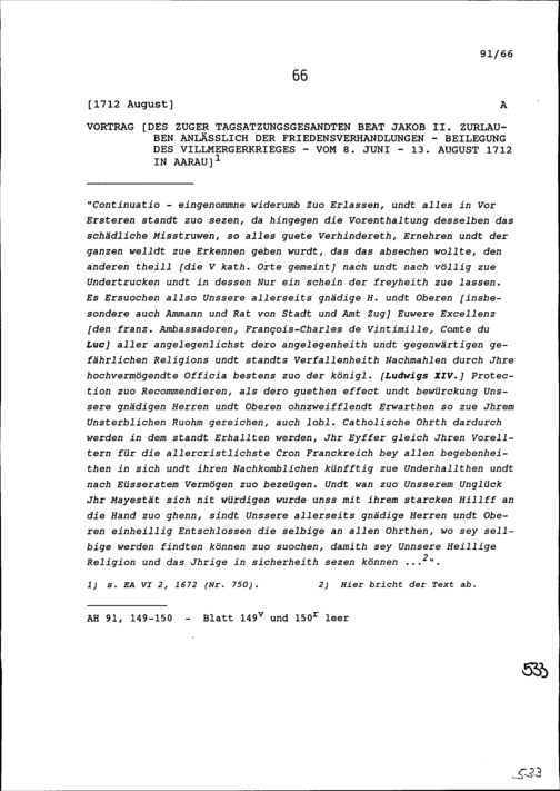 Vortrag von Beat Jakob II. Zurlauben, Zuger Tagsatzungsgesandter, anlässlich der Friedensverhandlungen um die Beilegung des Villmergerkriegs vom 8. Juni bis 13. August 1712 in Aarau
