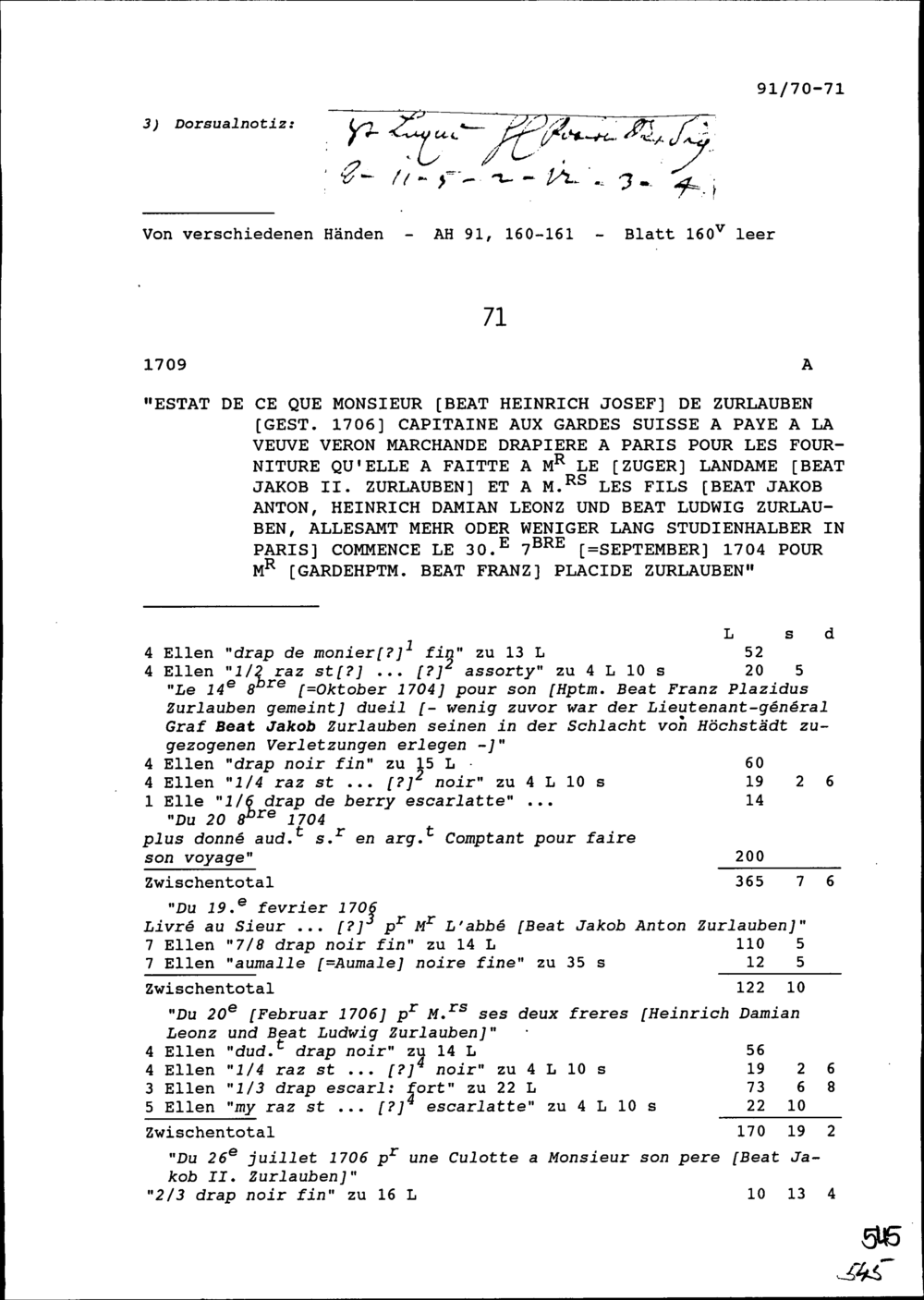 Rechnung von Beat Heinrich Josef Zurlauben, Hauptmann mit der NN Veron, Witwe, Tuchhändlerin in Paris für Lieferungen an Beat Jakob II. Zurlauben, Landammann und an Söhne Beat Jakob Anton, Heinrich Damian Leonz und Beat Ludwig Zurlauben, alle studienhalber in Paris, für Beat Franz Plazidus Zurlauben, Gardehauptmann