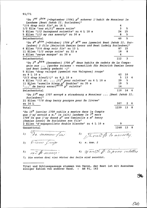 Rechnung von Beat Heinrich Josef Zurlauben, Hauptmann mit der NN Veron, Witwe, Tuchhändlerin in Paris für Lieferungen an Beat Jakob II. Zurlauben, Landammann und an Söhne Beat Jakob Anton, Heinrich Damian Leonz und Beat Ludwig Zurlauben, alle studienhalber in Paris, für Beat Franz Plazidus Zurlauben, Gardehauptmann