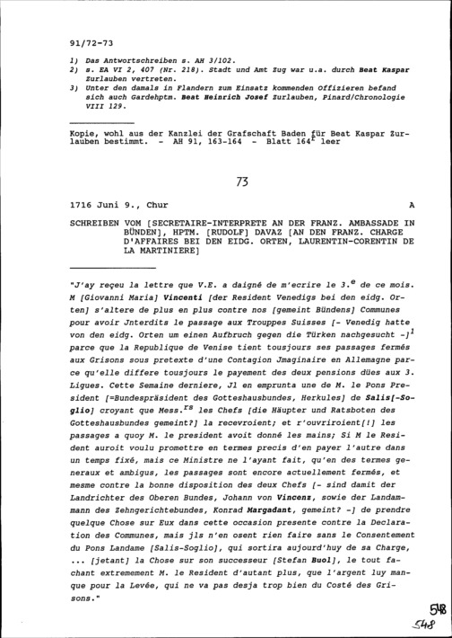 Schreiben von Rudolf Davaz, Hauptmann und Dolmetscher an der französischen Ambassade in Bünden, an Laurentin-Corentin de la Martinière, französischer Geschäftsträger bei den Eidgenössischen Orten