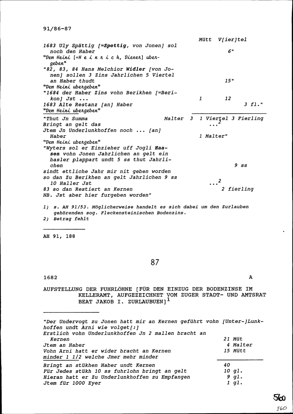 Aufstellung der Fuhrlöhne für den Einzug der Bodenzinse im Kelleramt, aufgezeichnet von Beat Jakob I. Zurlauben, Stadt- und Amtrat Zug