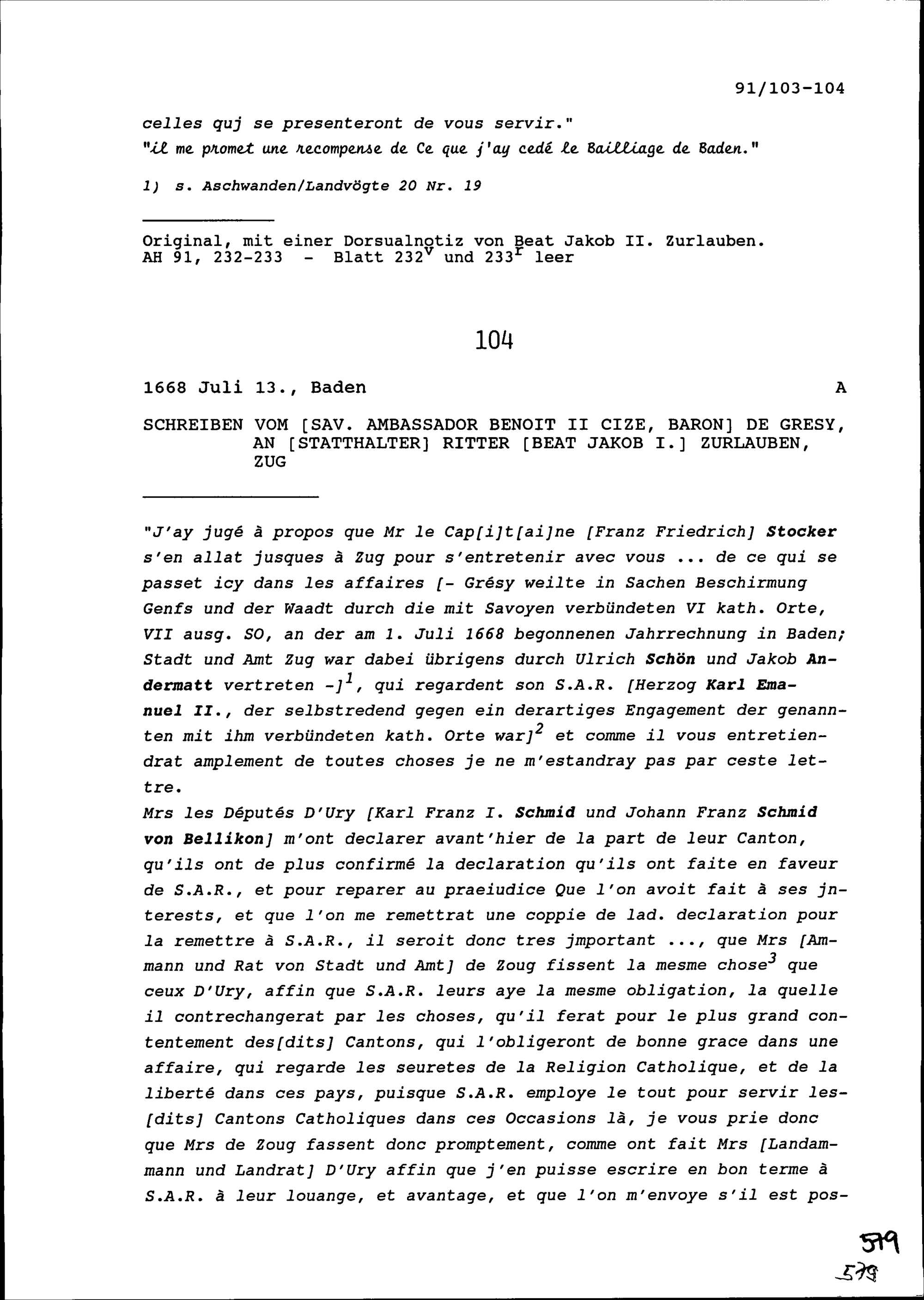 Schreiben von Benoît II. Cize, Baron de Grésy, Ambassador von Frankreich, an Beat Jakob I. Zurlauben, Statthalter, Zug