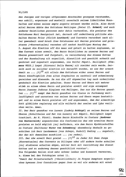 Notiz von Rudolf Reding, Schwyzer Tagsatzungsgesandter, über die Tagsatzung der Sieben in den Freien Ämter regierenden Orte vom 1. August 1595 in der Abtei Muri