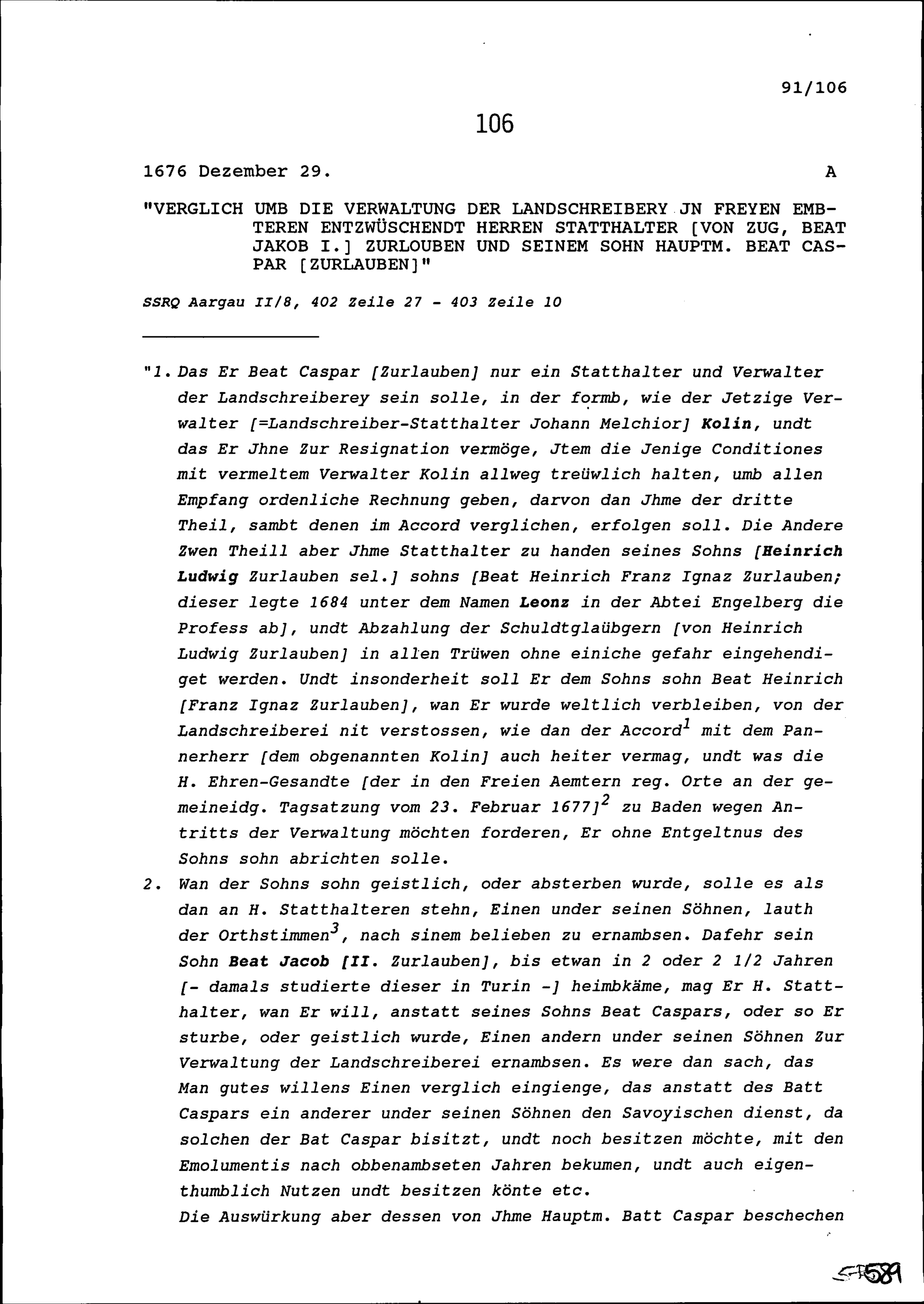 Vergleich zwischen Beat Jakob I. Zurlauben, Statthalter von Zug, und seinem Sohn Beat Kaspar Zurlauben, Hauptmann, wegen der Landschreiberei