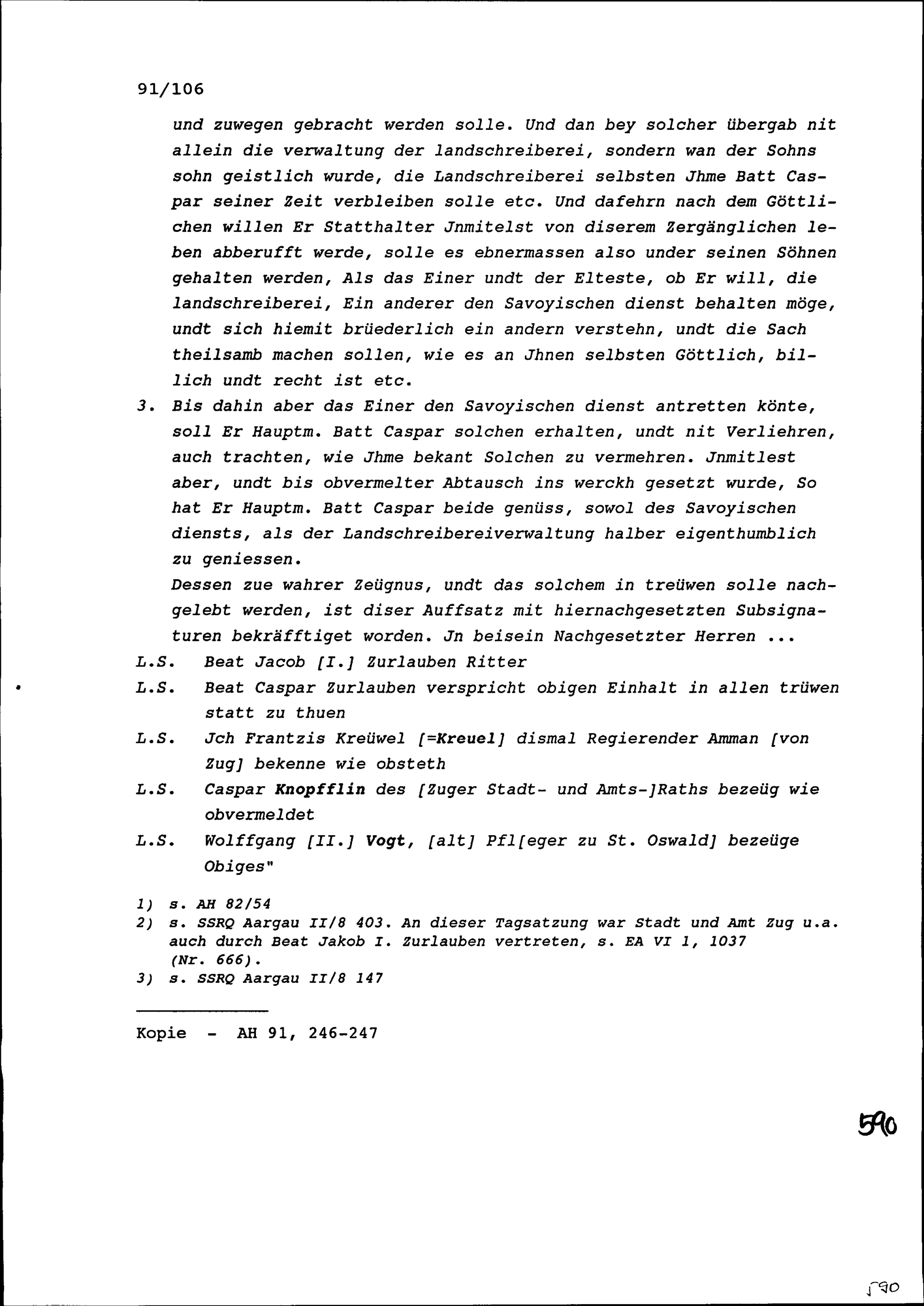 Vergleich zwischen Beat Jakob I. Zurlauben, Statthalter von Zug, und seinem Sohn Beat Kaspar Zurlauben, Hauptmann, wegen der Landschreiberei