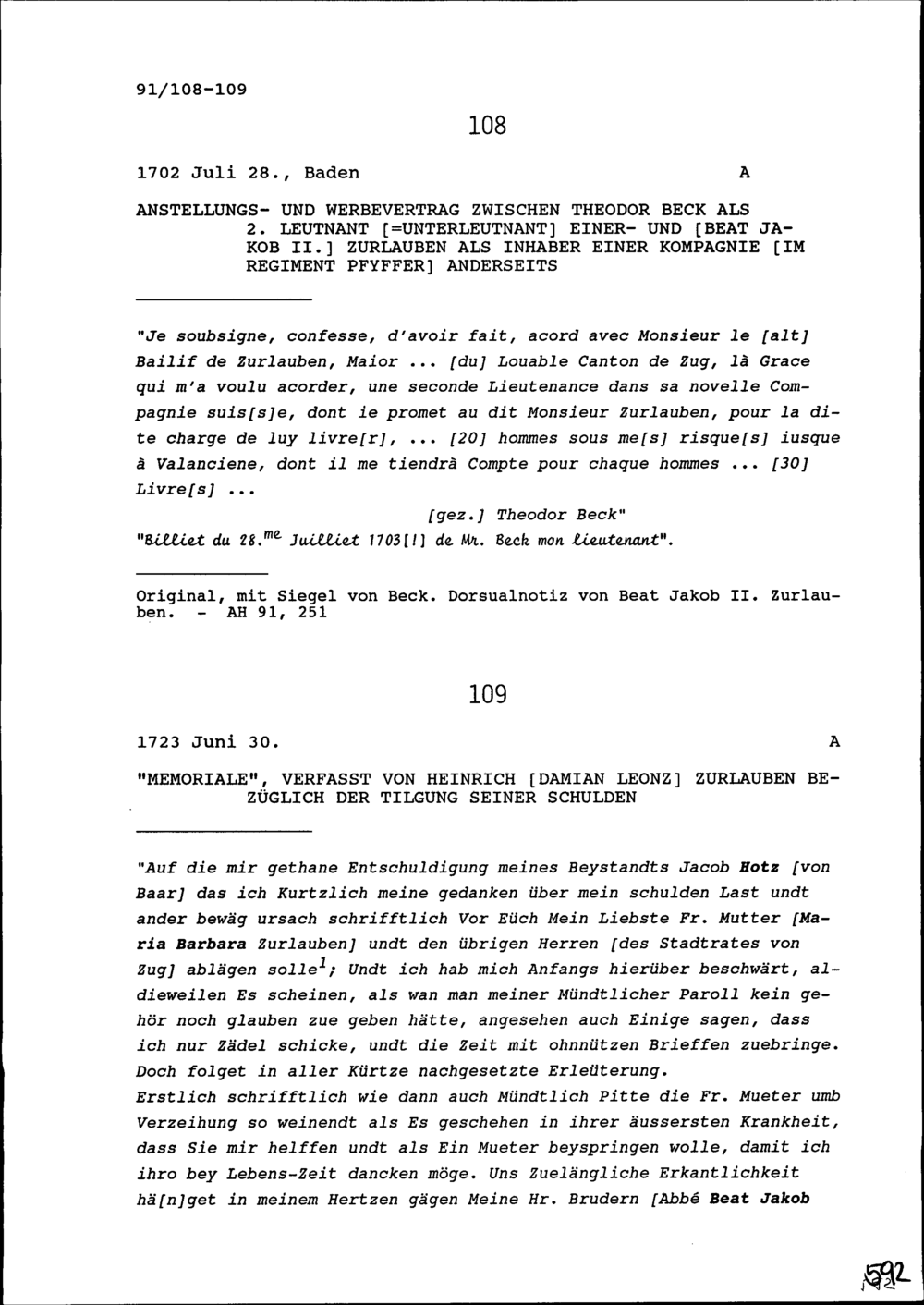 Anstellungs- und Werbevertrag zwischen Theodor Beck, Unterleutnant) einerseits und Beat Jakob II. Zurlauben, Inhaber einer Kompanie im Regiment Pfyffer, anderseits