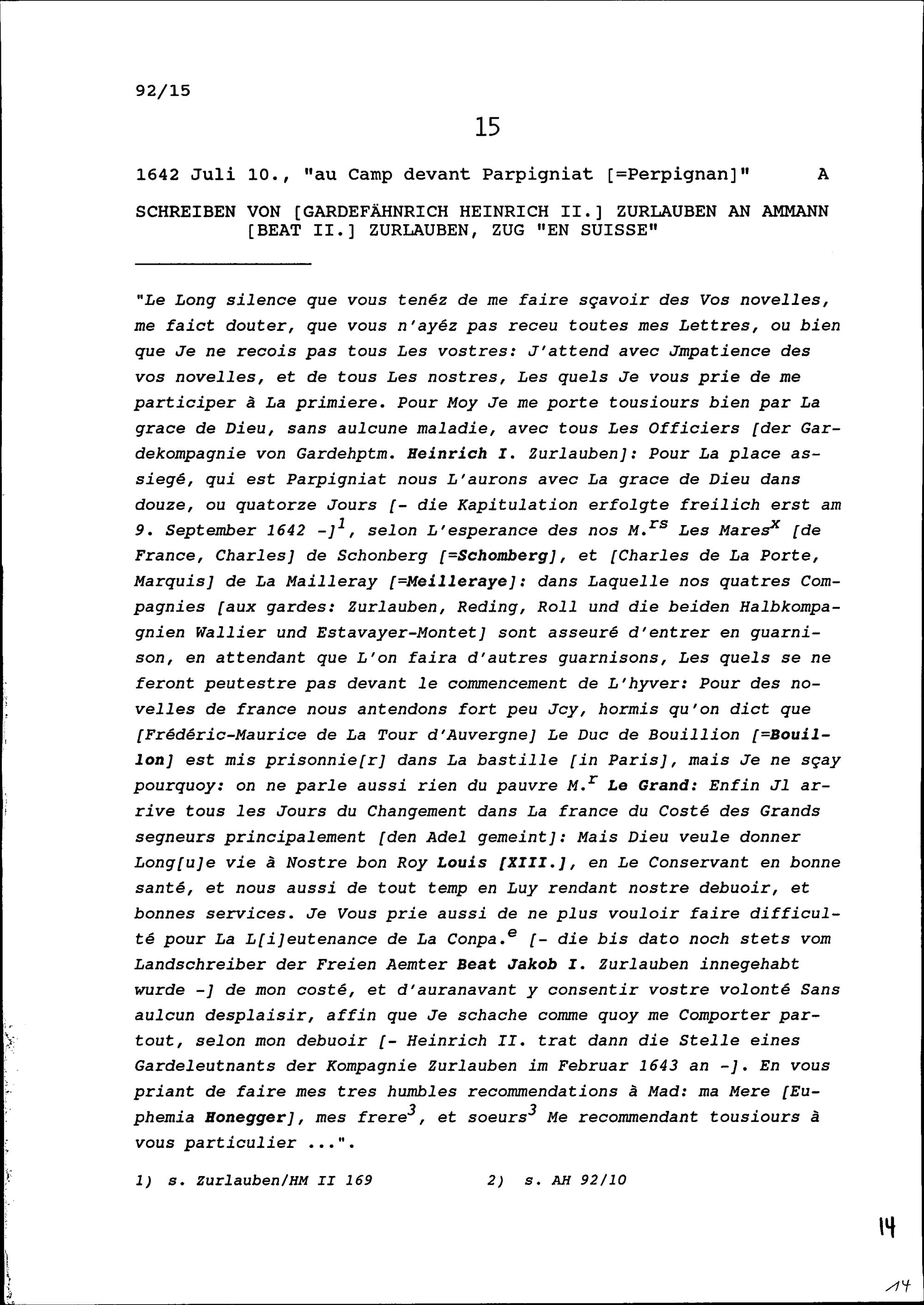 Schreiben von Heinrich II. Zurlauben, Gardefähnrich, an Beat II. Zurlauben, Ammann, Zug
