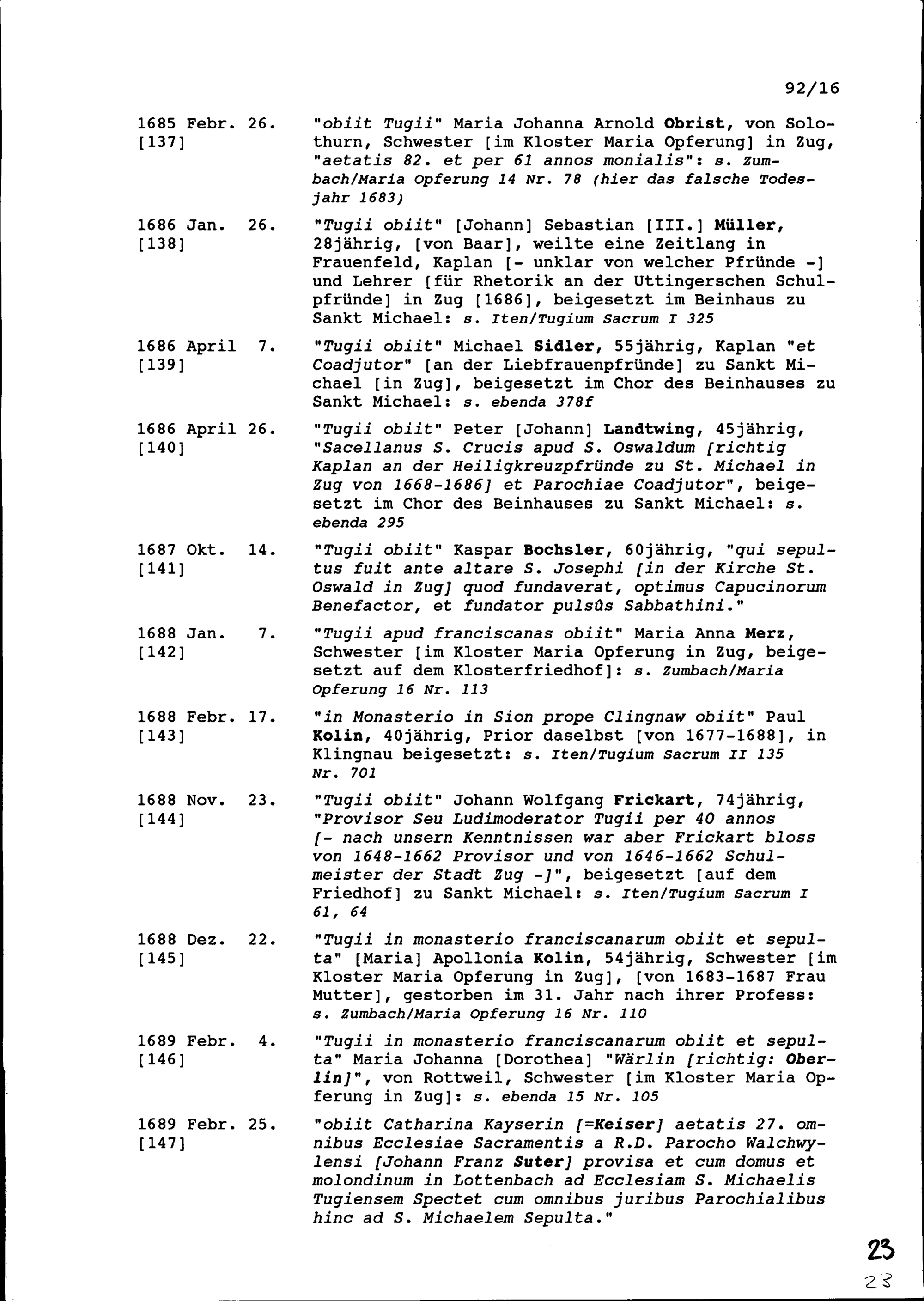 Auszug Sterberegistern betreffend geistliche Personen, gestorben zwischen 1611 und 1755, aufgezeichnet von Beat Fidel Zurlauben