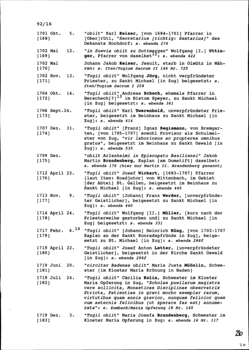 Auszug Sterberegistern betreffend geistliche Personen, gestorben zwischen 1611 und 1755, aufgezeichnet von Beat Fidel Zurlauben