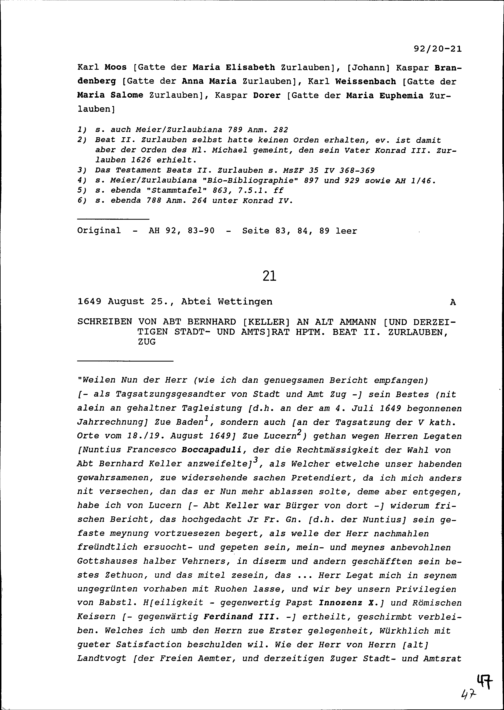 Schreiben von Bernhard Keller, Abt von Wettingen, an Beat II. Zurlauben, Hauptmann und Stadt- und Amtrat, Zug
