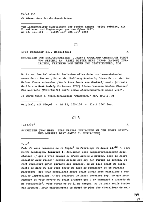 Schreiben von Johann Marquard Christoph Burtz von Seethal, Stadtschreiber, an Beat Jakob Anton Zurlauben, Priester, Zug