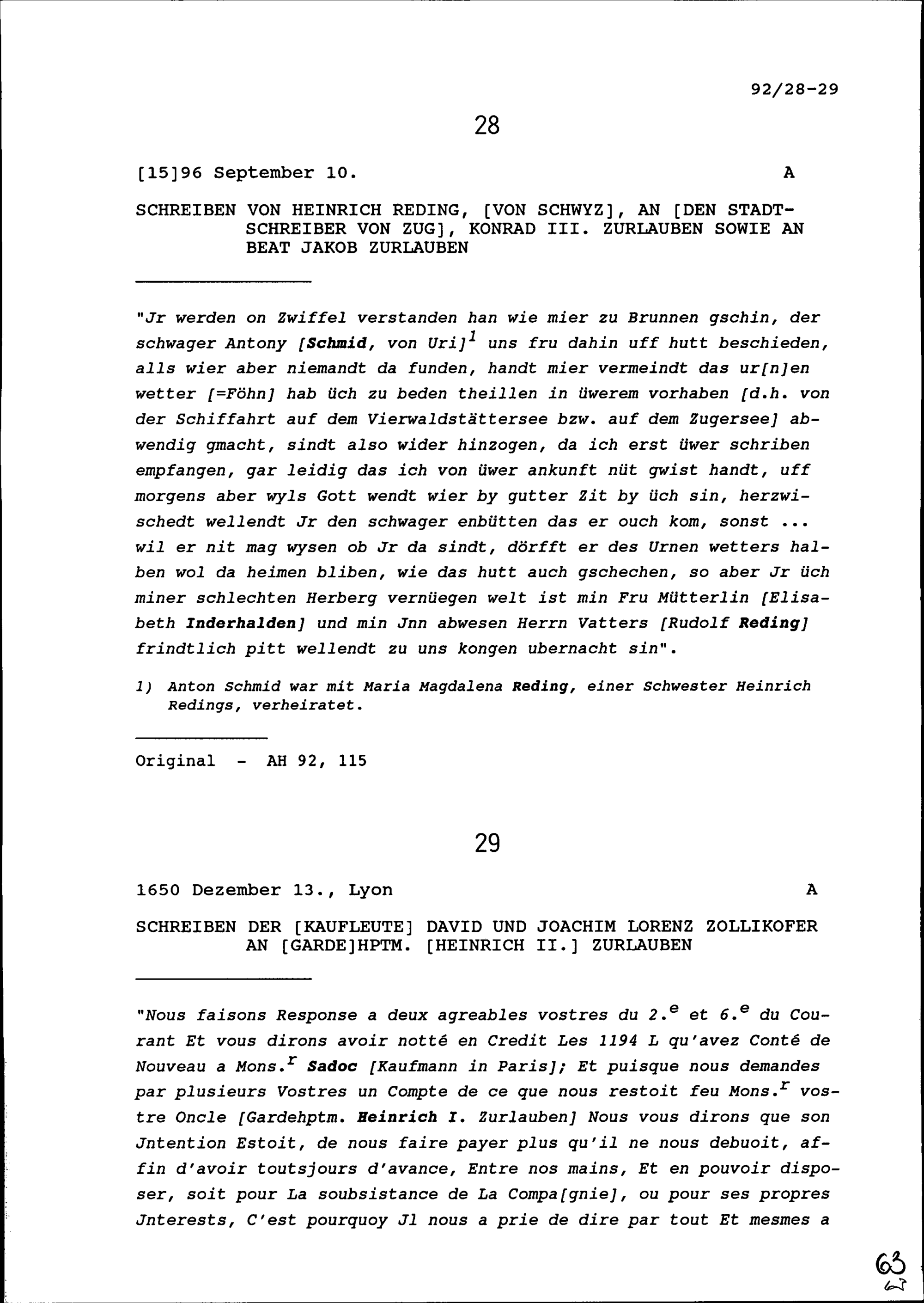 Schreiben von Heinrich Reding, von Schwyz, an Konrad III. Zurlauben, Stadtschreiber von Zug, sowie an Beat Jakob Zurlauben