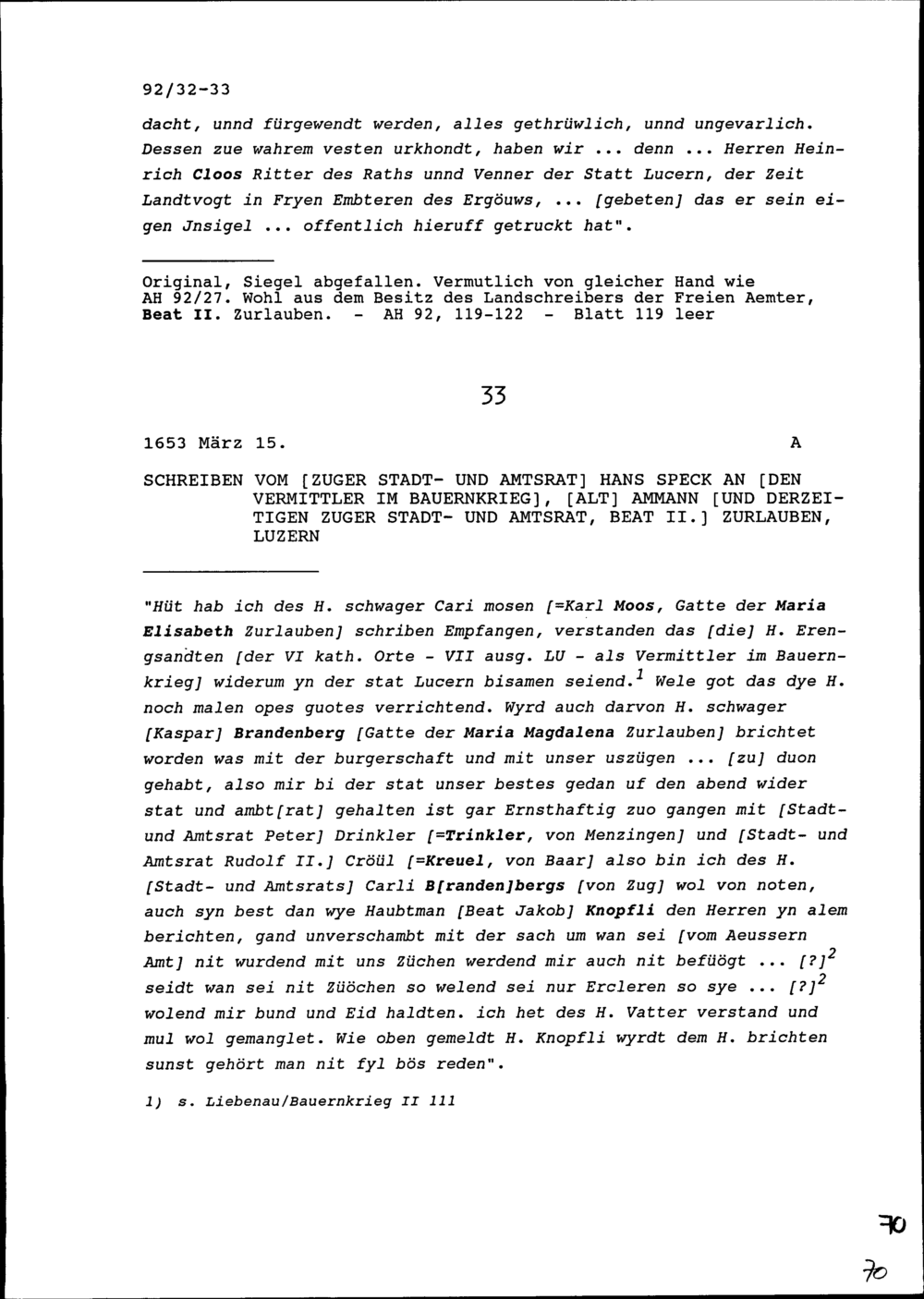 Schreiben von Hans Speck, Stadt- und Amtrat Zug, an Beat II. Zurlauben, Vermittler im Bauernkrieg, Altammann und Stadt- und Amtrat Zug, Luzern