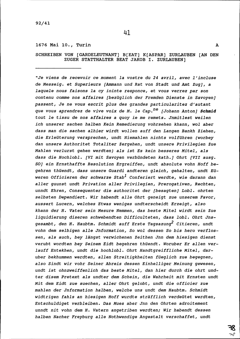 Schreiben von Beat Kaspar Zurlauben, Gardeleutnant, an Beat Jakob I. Zurlauben, Statthalter Zug