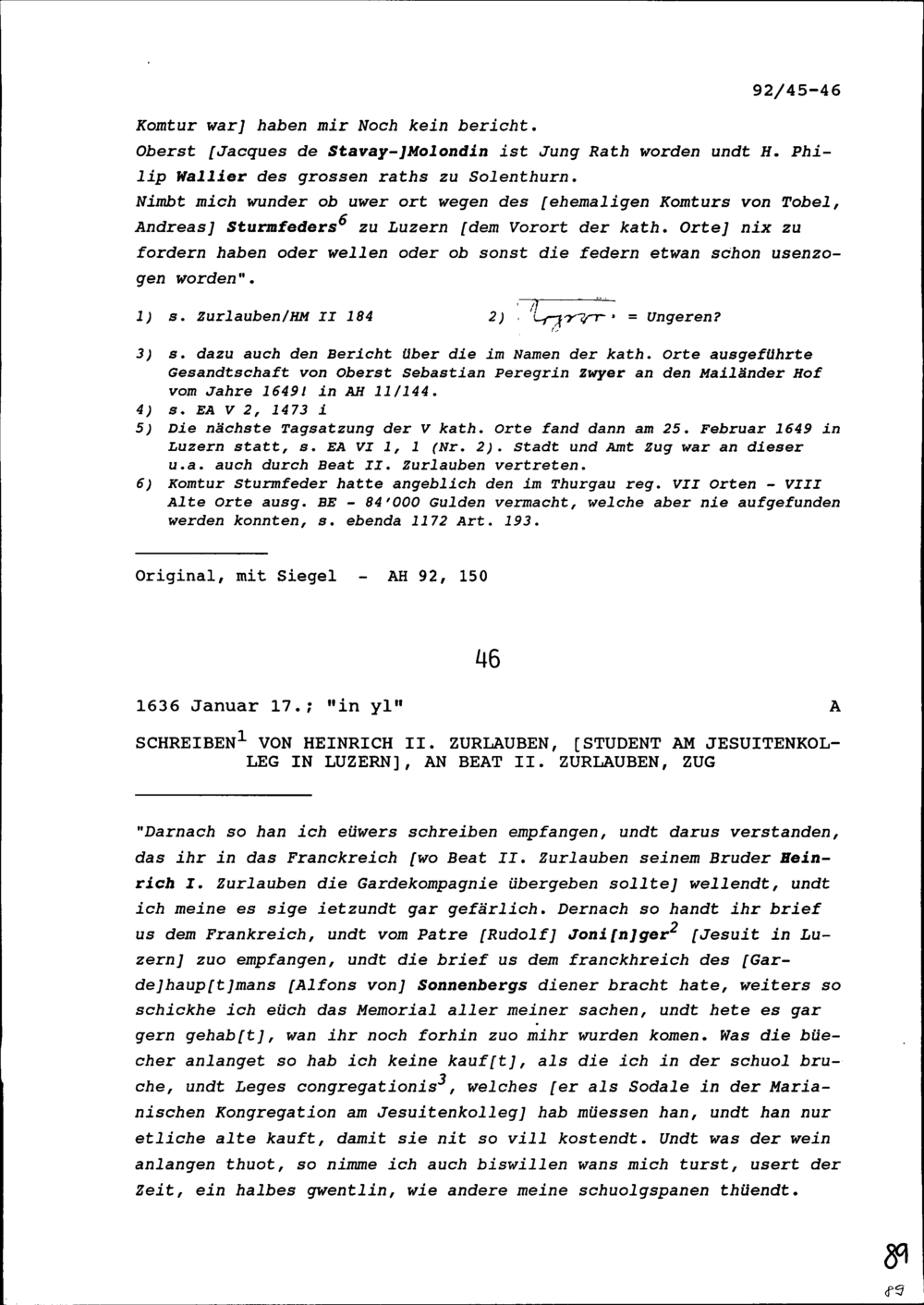Schreiben von Heinrich II. Zurlauben, Student am Jesuitenkolleg in Luzern, an Beat...