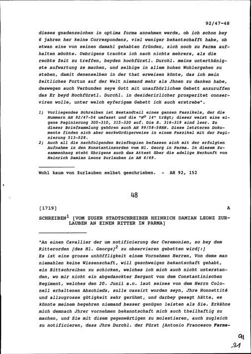 Schreiben von Heinrich Damian Leonz Zurlauben, Zuger Stadtschreiber, an einen Ritter in Parma