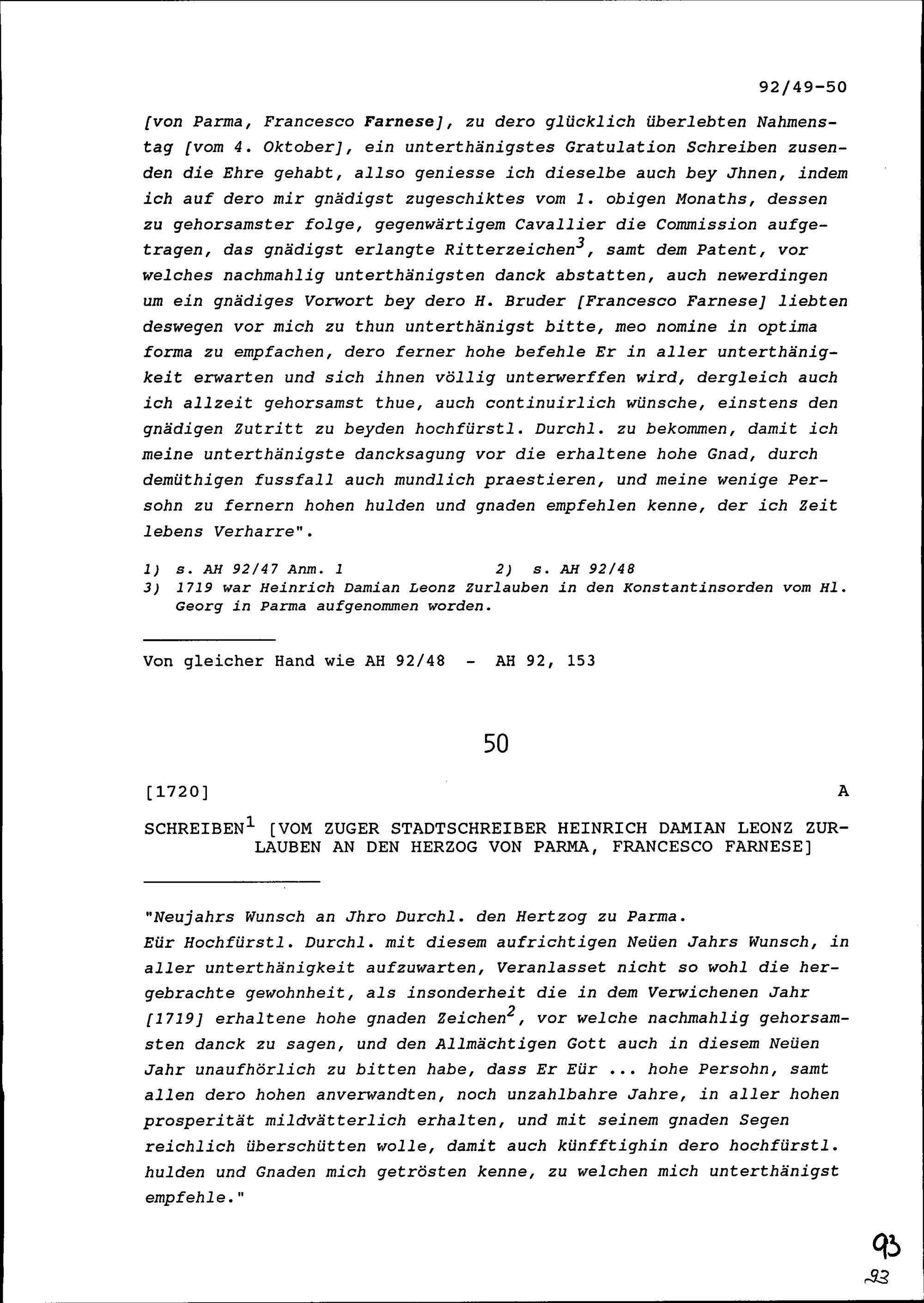 Schreiben von Heinrich Damian Leonz Zurlauben, Zuger Stadtschreiber, an Francesco Farnese, Herzog von Parma