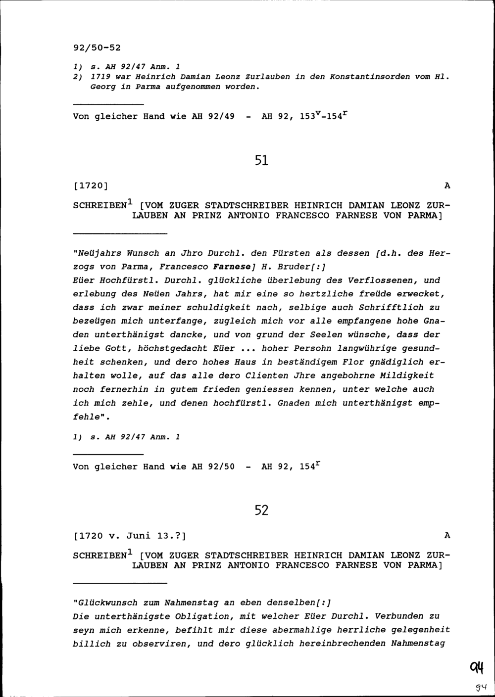 Schreiben von Heinrich Damian Leonz Zurlauben, Zuger Stadtschreiber, an Antonio Francesco Farnese von Parma