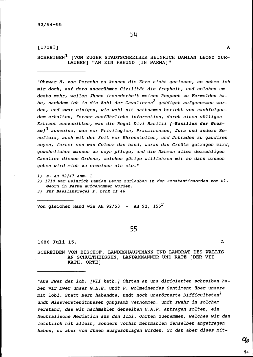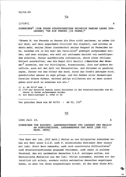Schreiben von Heinrich Damian Leonz Zurlauben, Zuger Stadtschreiber, an einen Freund in Parma"