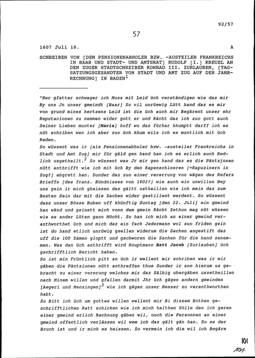 Schreiben von Rudolf I. Kreuel, Pensionenabholer und Pensionenausteiler Frankreichs in Baar und Stadt- und Amtrat, an Konrad III. Zurlauben, Zuger Stadtschreiber und Tagsatzungsgesandter von Stadt und Amt Zug auf der Jahrrechnung in Baden