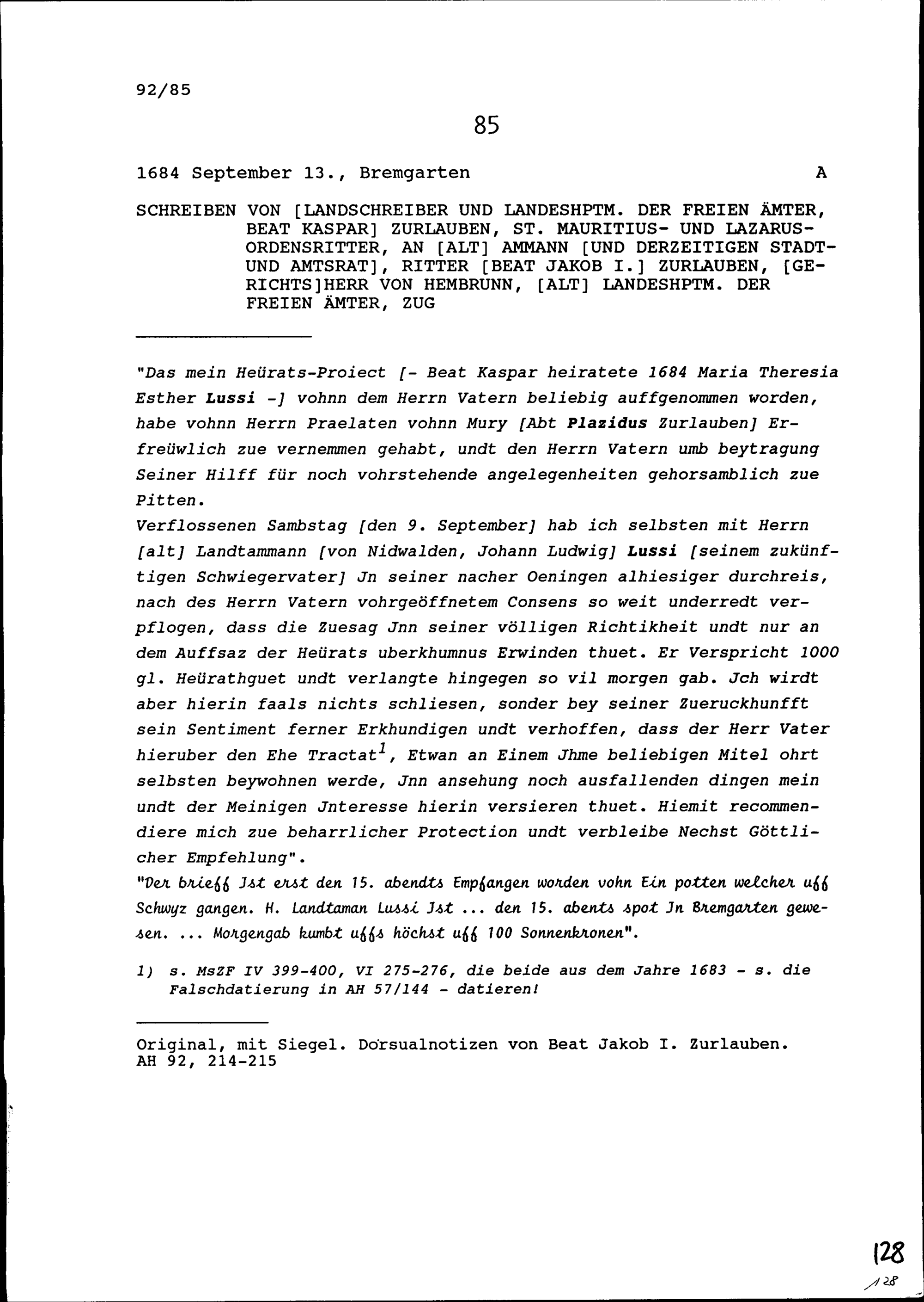 Schreiben von Beat Kaspar Zurlauben, Landschreiber und Landeshauptmann der Freien...