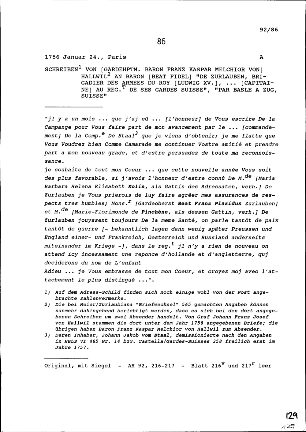 Schreiben von Franz Kaspar Melchior von Hallwil, Gardehauptmann, an Beat Fidel Zurlauben, Brigadier, Zug