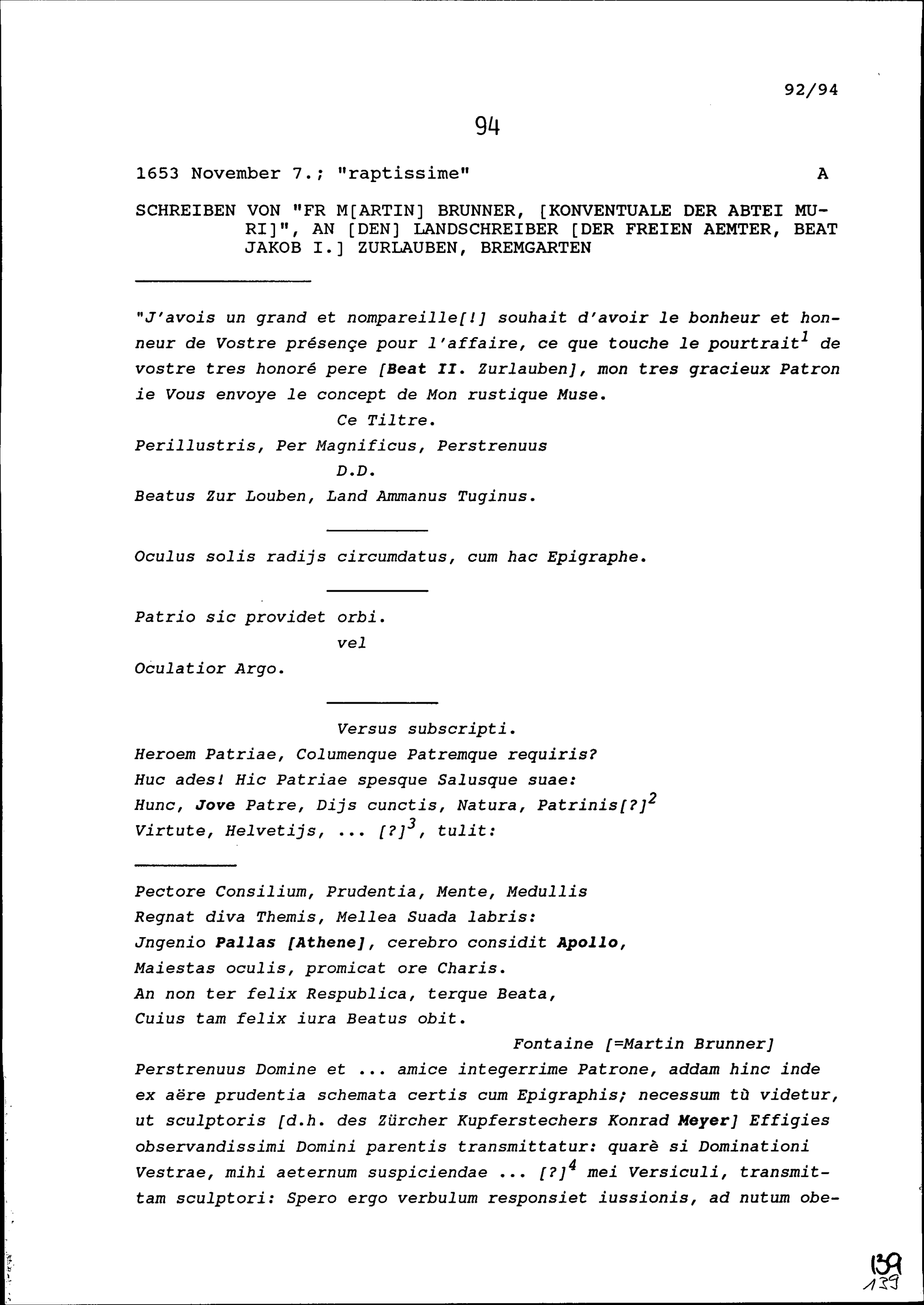 Schreiben von Martin Brunner, Benediktinerpater der Abtei Muri, an Beat Jakob I....