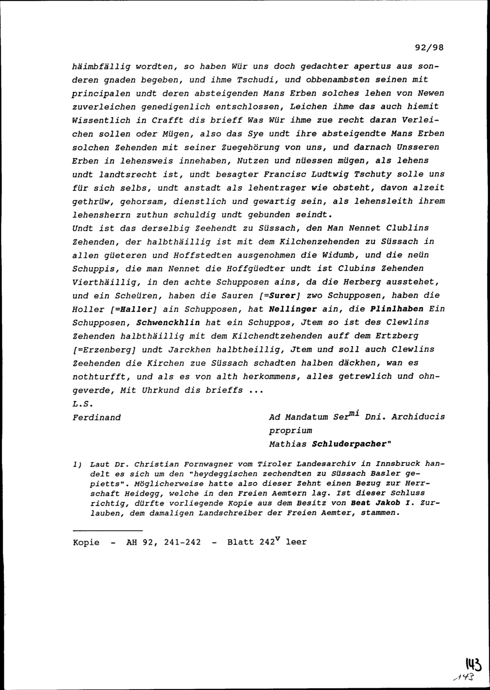 Verleihung des Zehnten zu Sissach an Franz Ludwig Tschudi