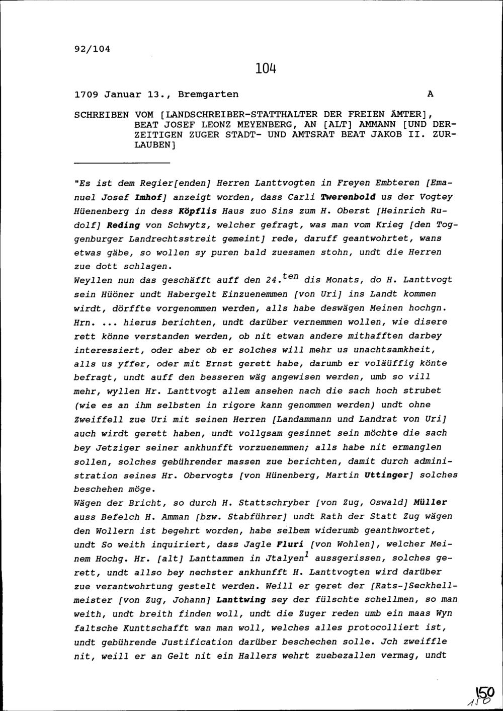 Schreiben von Beat Josef Leonz Meyenberg, Landschreiberstatthalter der Freien Ämter, an Beat Jakob II. Zurlauben, Altammann und Stadt- und Amtrat Zug