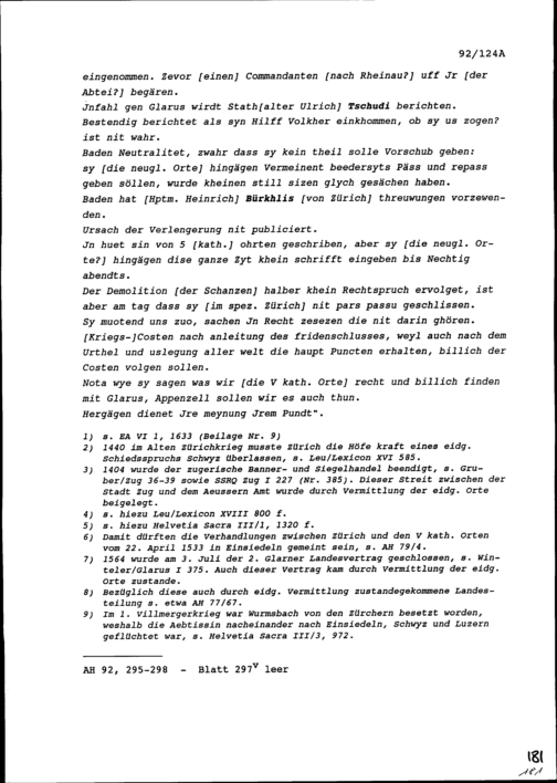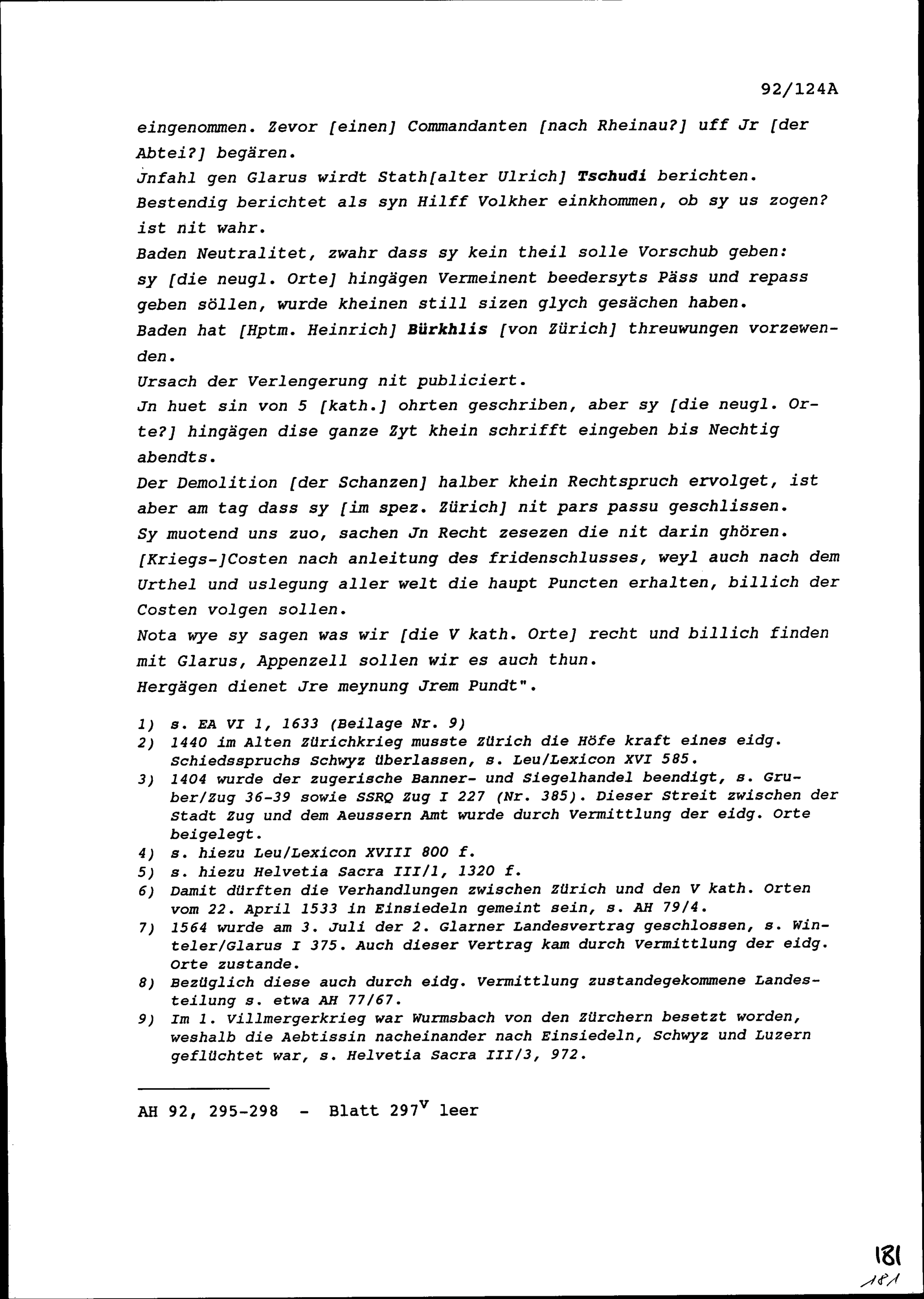 Notiz von Beat II. Zurlauben, Stadt- und Amtrat Zug, über die Friedensverhandlungen nach dem ersten Villmergerkrieg