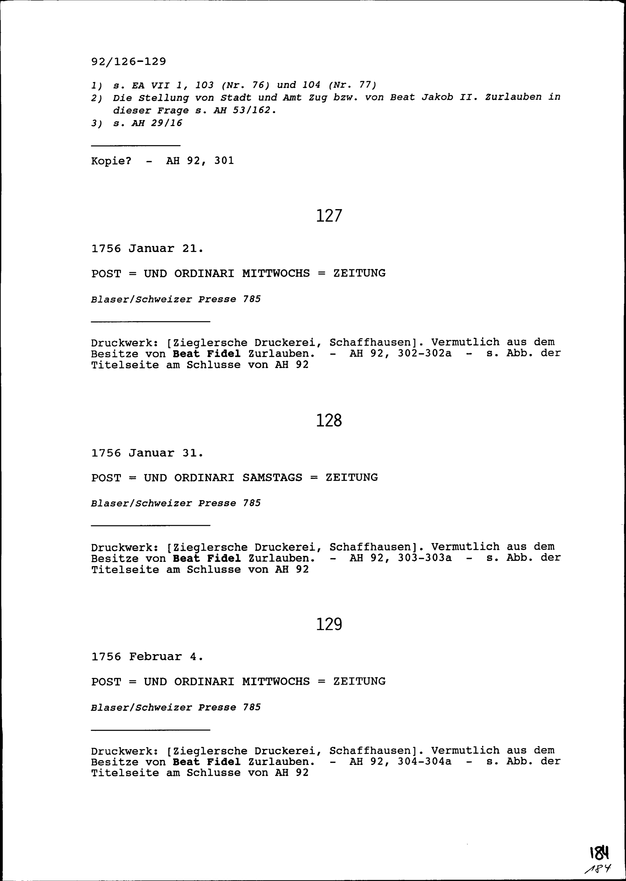 Druck: Post- und Ordinari Mittwochszeitung