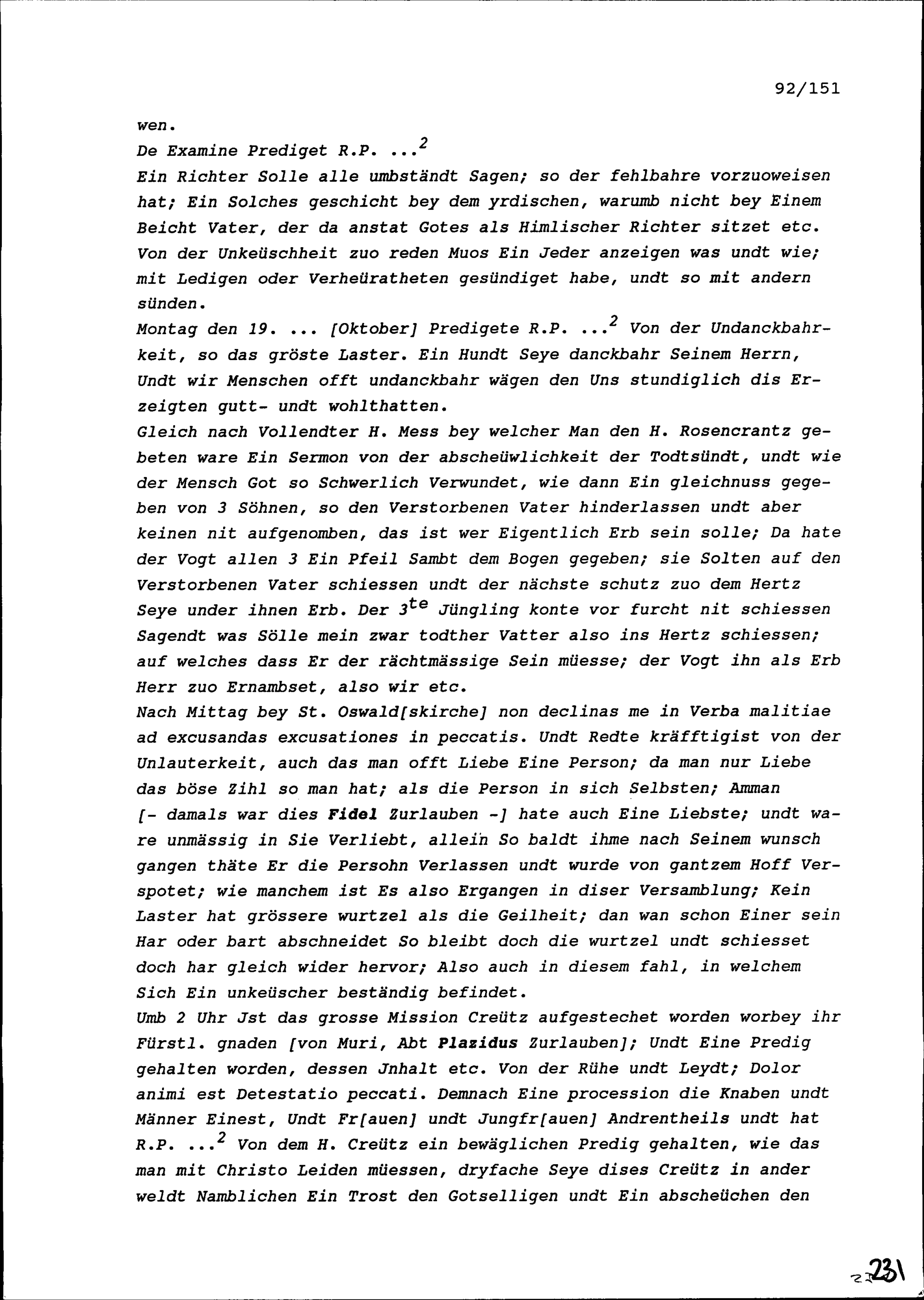 Bericht von Heinrich Damian Leonz Zurlauben über die Volksmission von Dionys Deuber, Charles Maillardoz und Adam Flotto, alle Jesuitenpatres, in der Stadt Zug