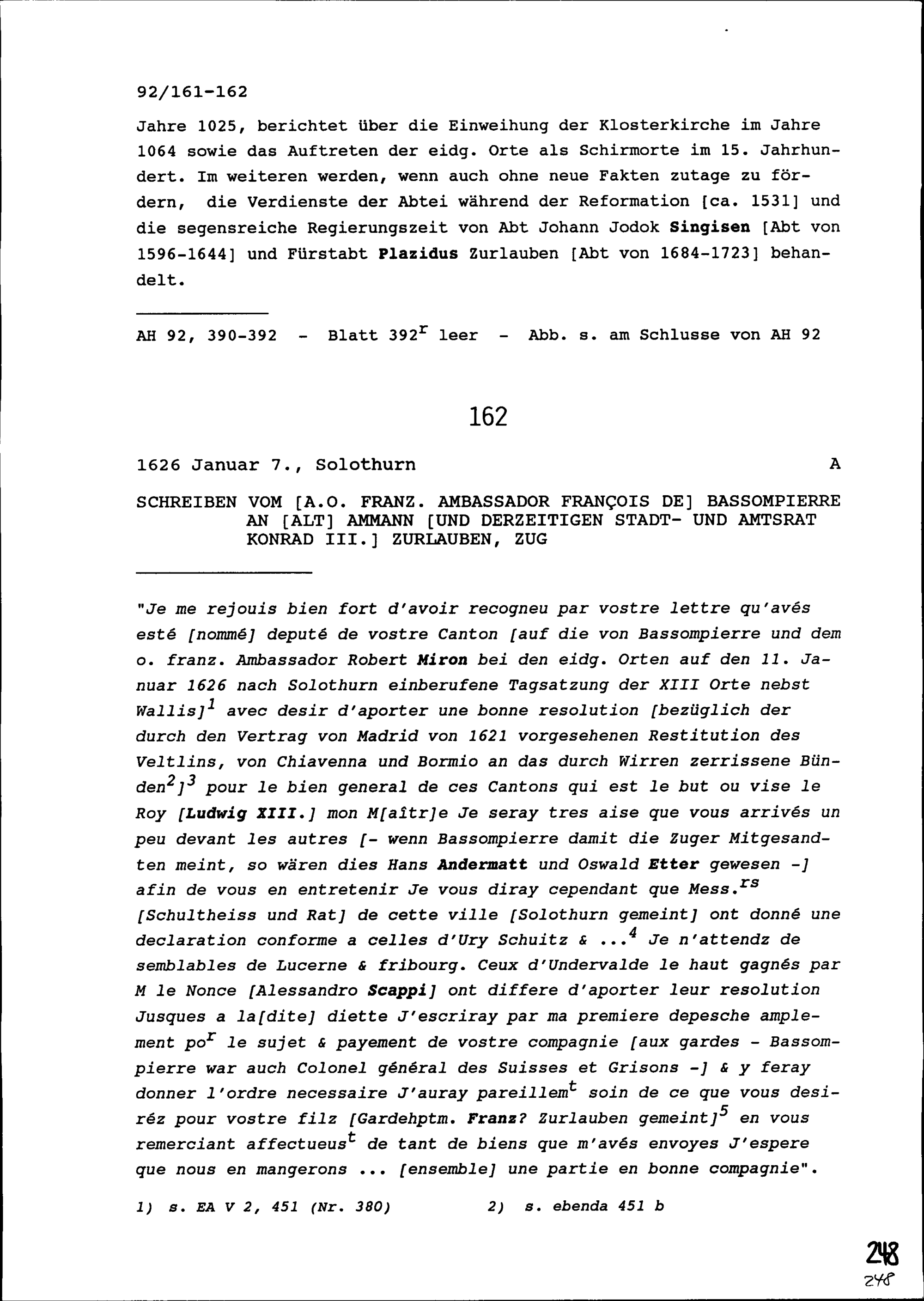 Schreiben von François de Bassompierre, ausserordentlicher Ambassador von Frankreich, an Konrad III. Zurlauben, Altammann und Stadt- und Amtrat, Zug