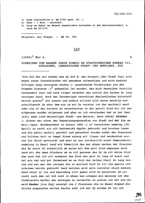 Schreiben von Jakob Schmid, Baar, an Konrad III. Zurlauben, Stadtschreiber und Stadt- und Amtrat, Zug