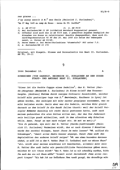Schreiben von Heinrich II. Zurlauben, Gardeleutnant, an Beat II. Zurlauben, Stadt- und Amtrat Zug