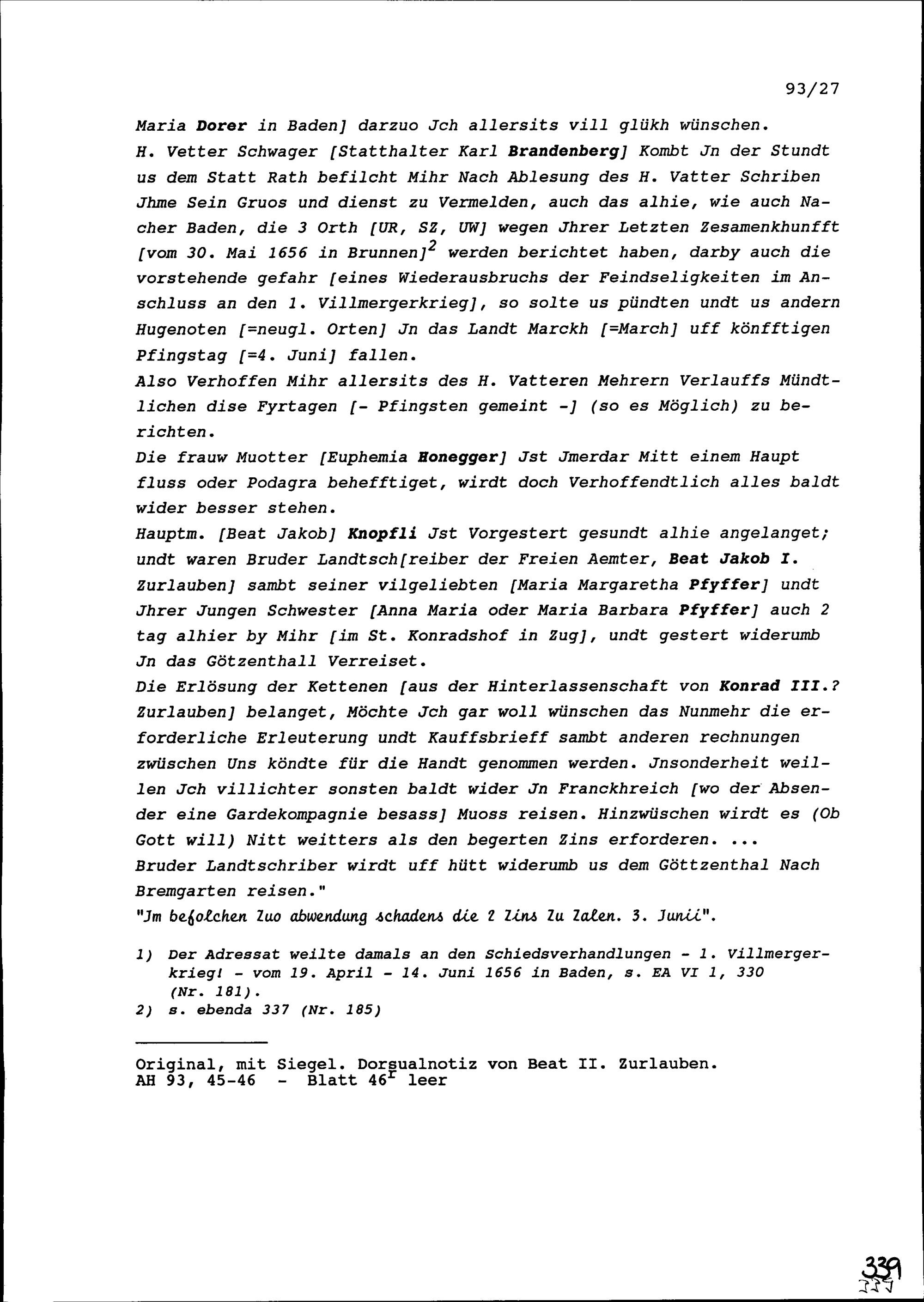 Schreiben von Heinrich II. Zurlauben, Oberstfeldwachtmeister, an Beat II. Zurlauben, Zuger Tagsatzungsgesandter und Altammann, Baden