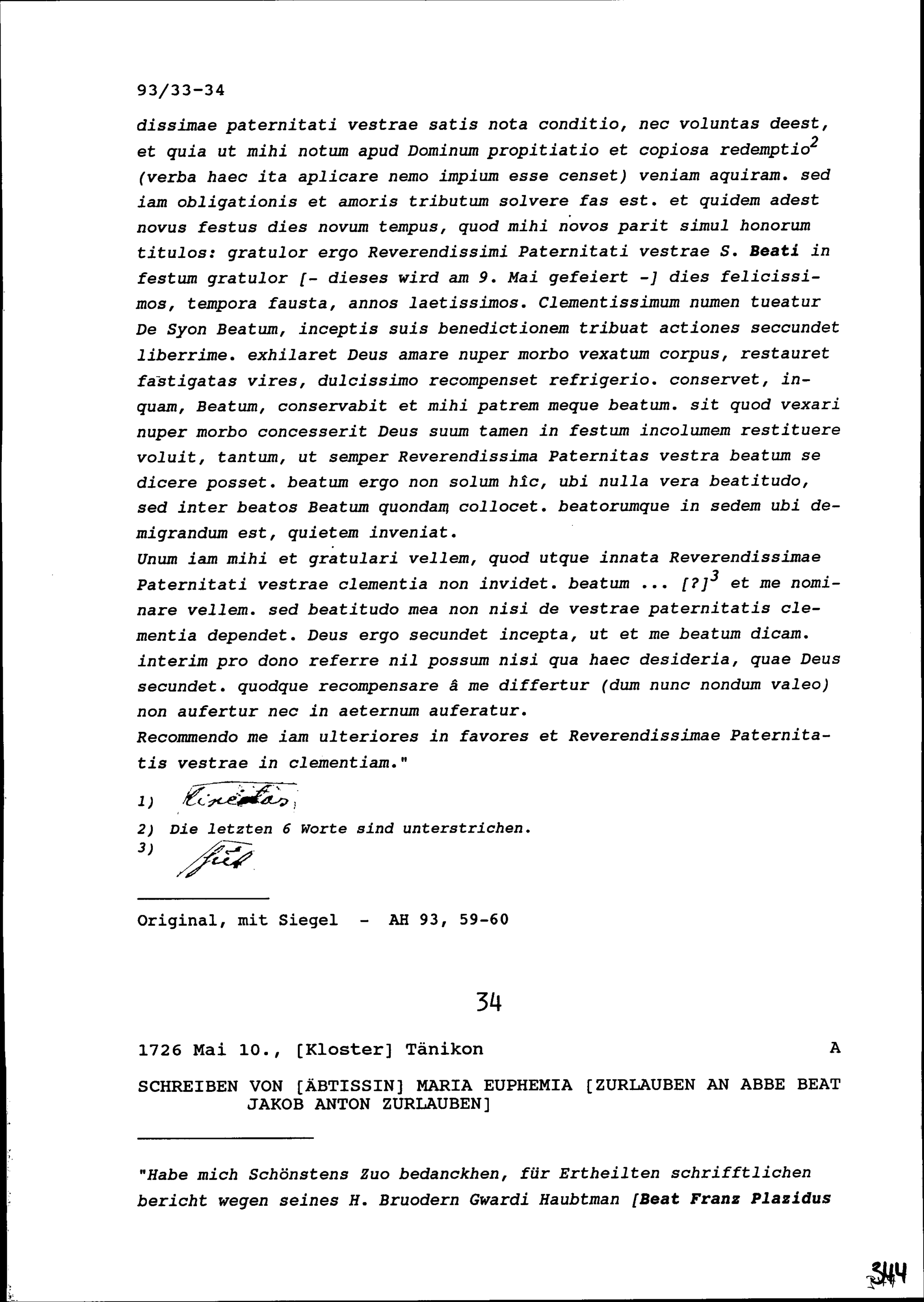 Schreiben von Maria Euphemia Zurlauben, Äbtissin von Tänikon, an Beat Jakob Anton Zurlauben, Priester