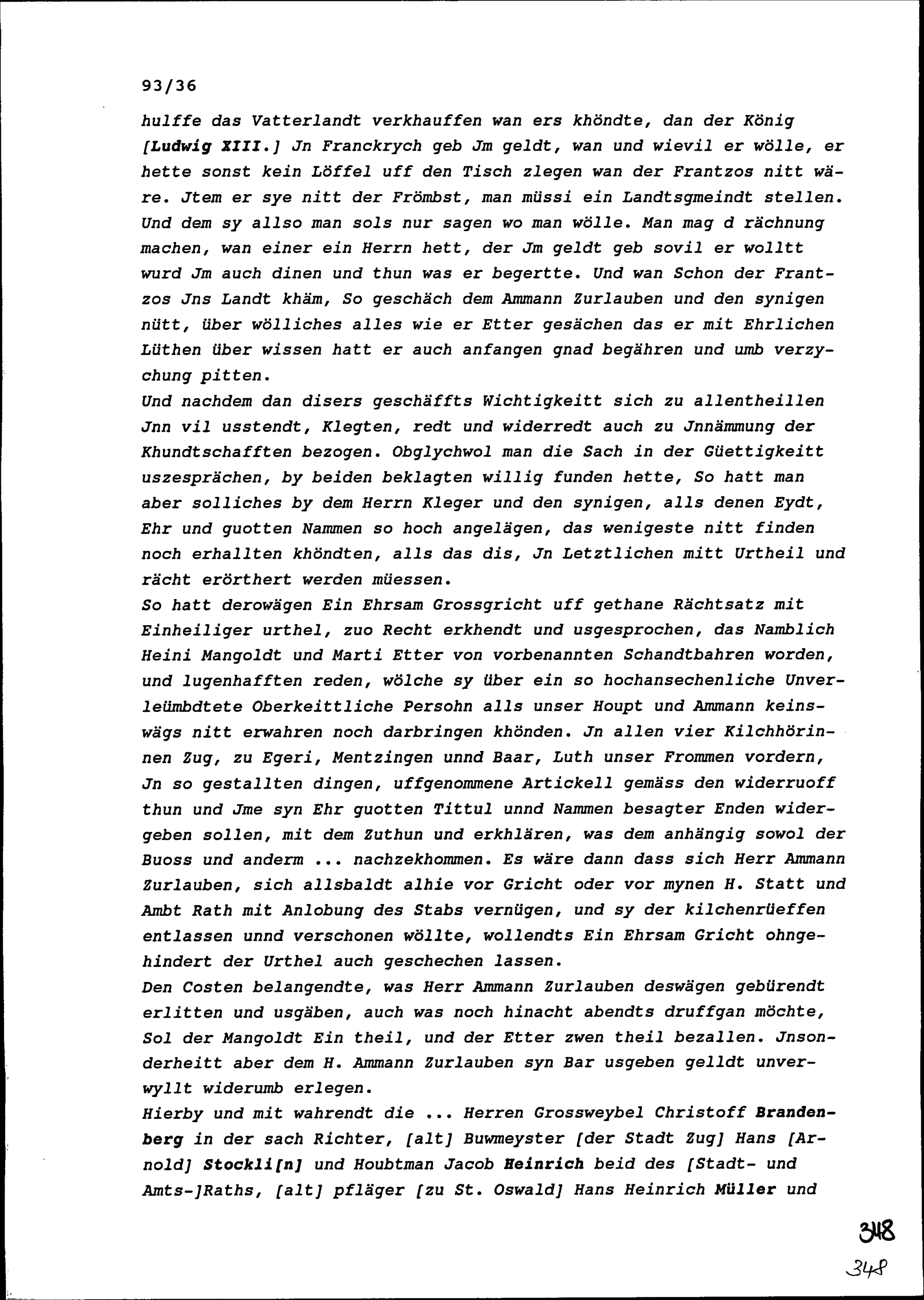 Urteil des Grossgerichts von Stadt und Amt Zug im Verleumdungsprozess zwischen Beat II. Zurlauben, Ammann, einerseits und Heinrich Mangold und Martin Etter, beide von Neuheim, anderseits