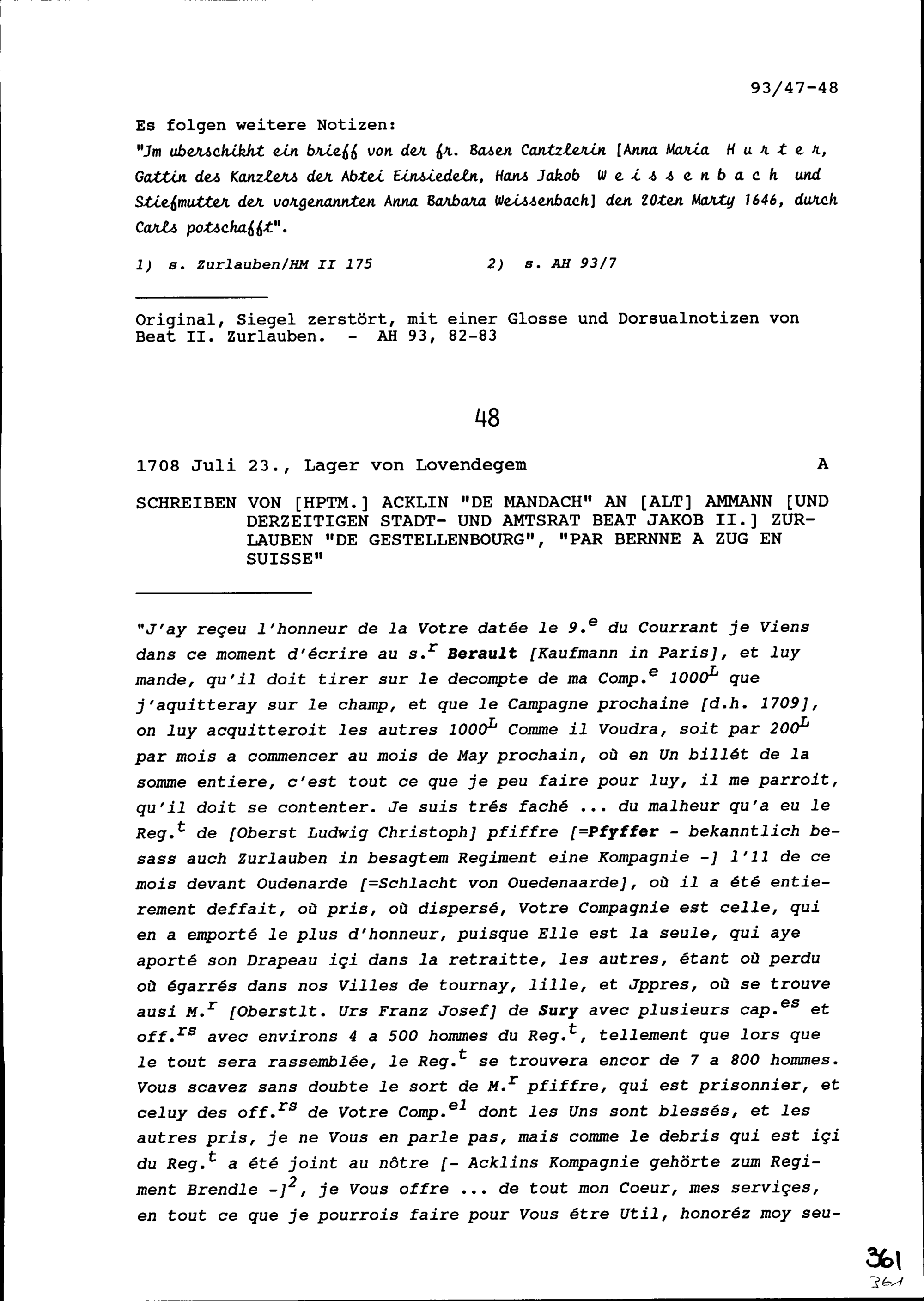 Schreiben von NN Acklin von Mandach, Hauptmann, an Beat Jakob II. Zurlauben, Altammann und Stadt- und Amtrat, Zug