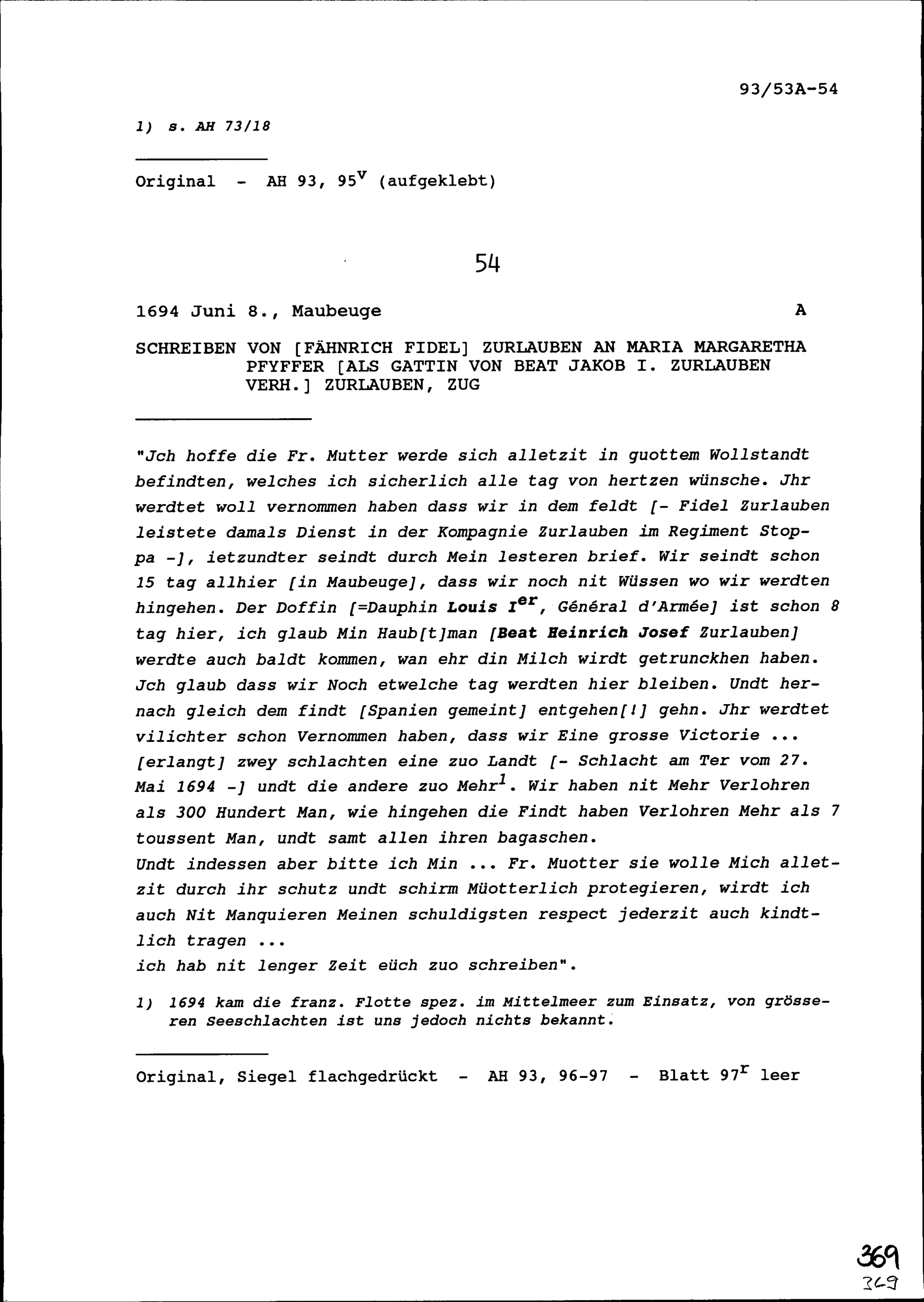 Schreiben von Fidel Zurlauben, Fähnrich, an Maria Margaretha Pfyffer, Gattin von Beat Jakob I. Zurlauben, Zug