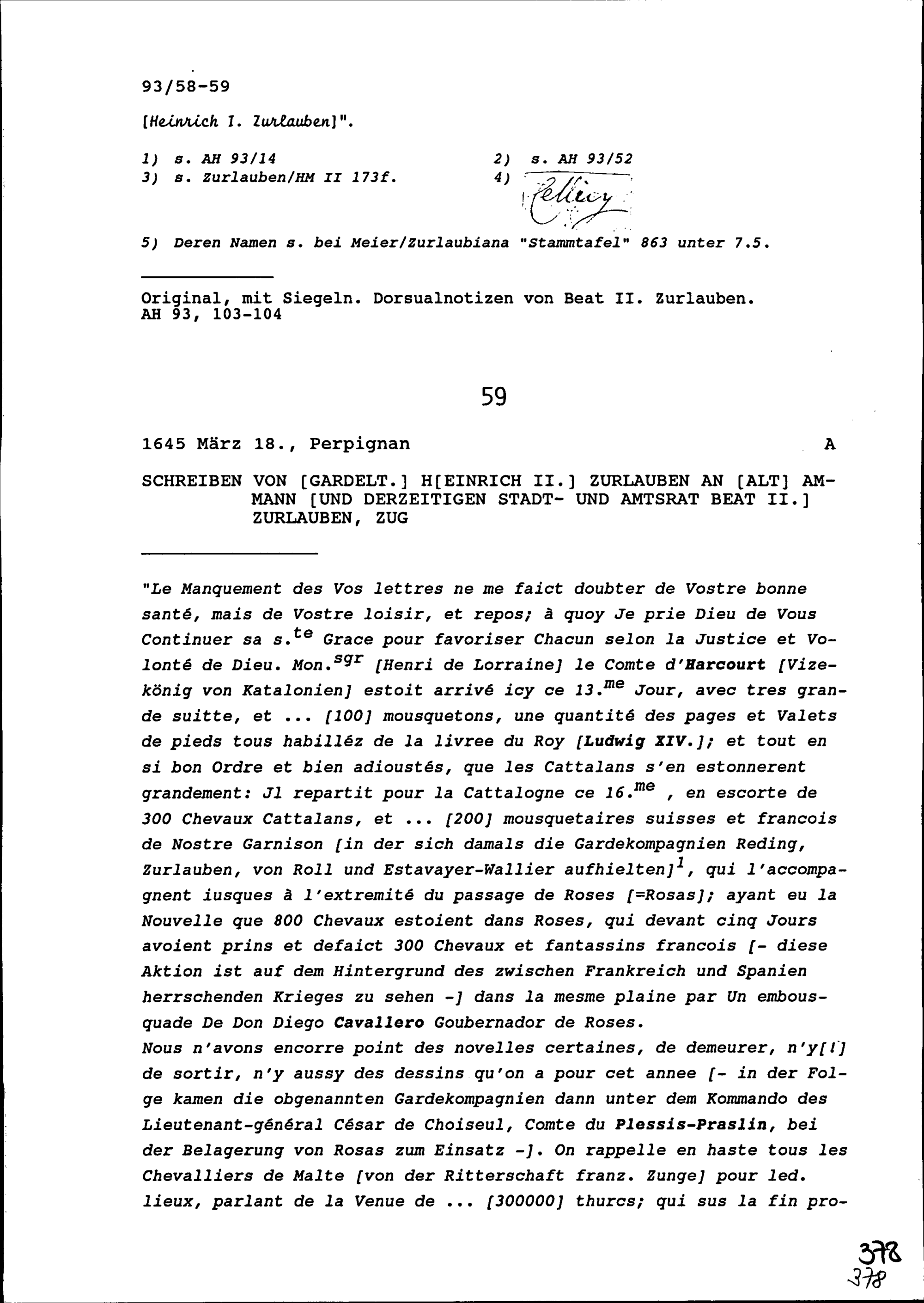 Schreiben von Heinrich II. Zurlauben, Gardeleutnant, an Beat II. Zurlauben, Altammann und Stadt- und Amtrat, Zug