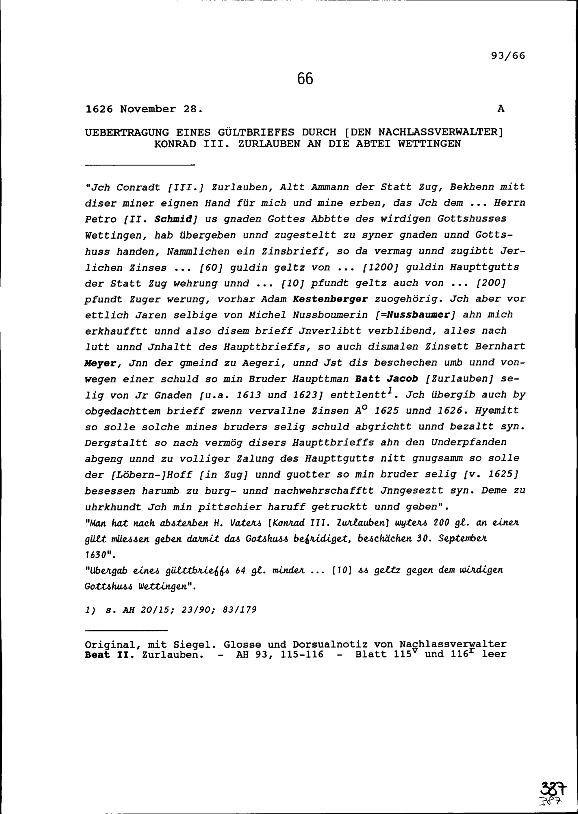 Übertragung eines Gültbriefs durch Konrad III. Zurlauben, Nachlassverwalter, an die Abtei Wettingen
