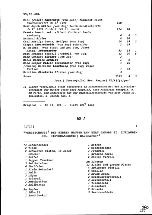Verzeichnis des hinterlassenen Hausrats von Beat Jakob II. Zurlauben, Hauptmann, selig
