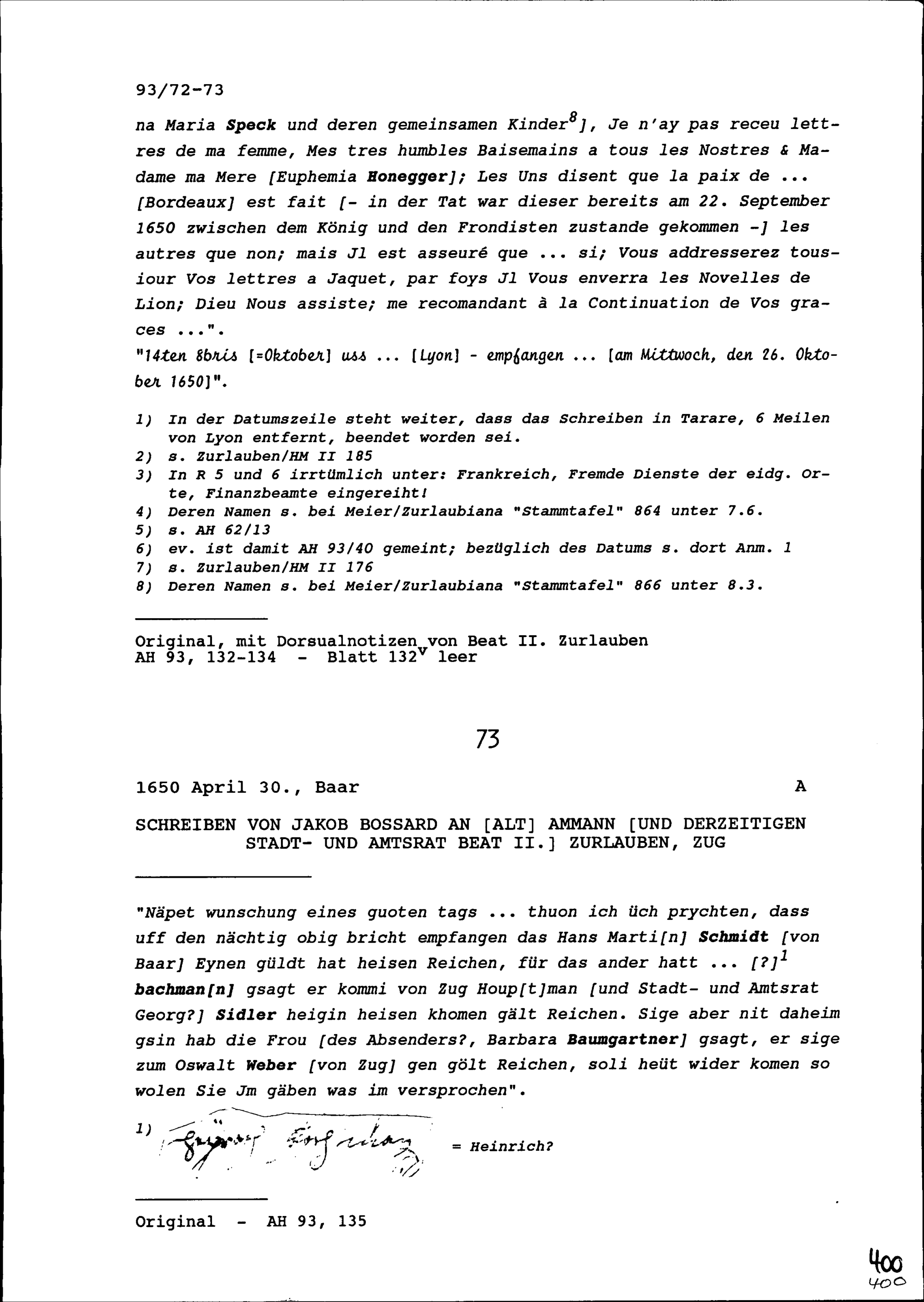 Schreiben von Jakob Bossard an Beat II. Zurlauben, Altammann und Stadt- und Amtrat, Zug