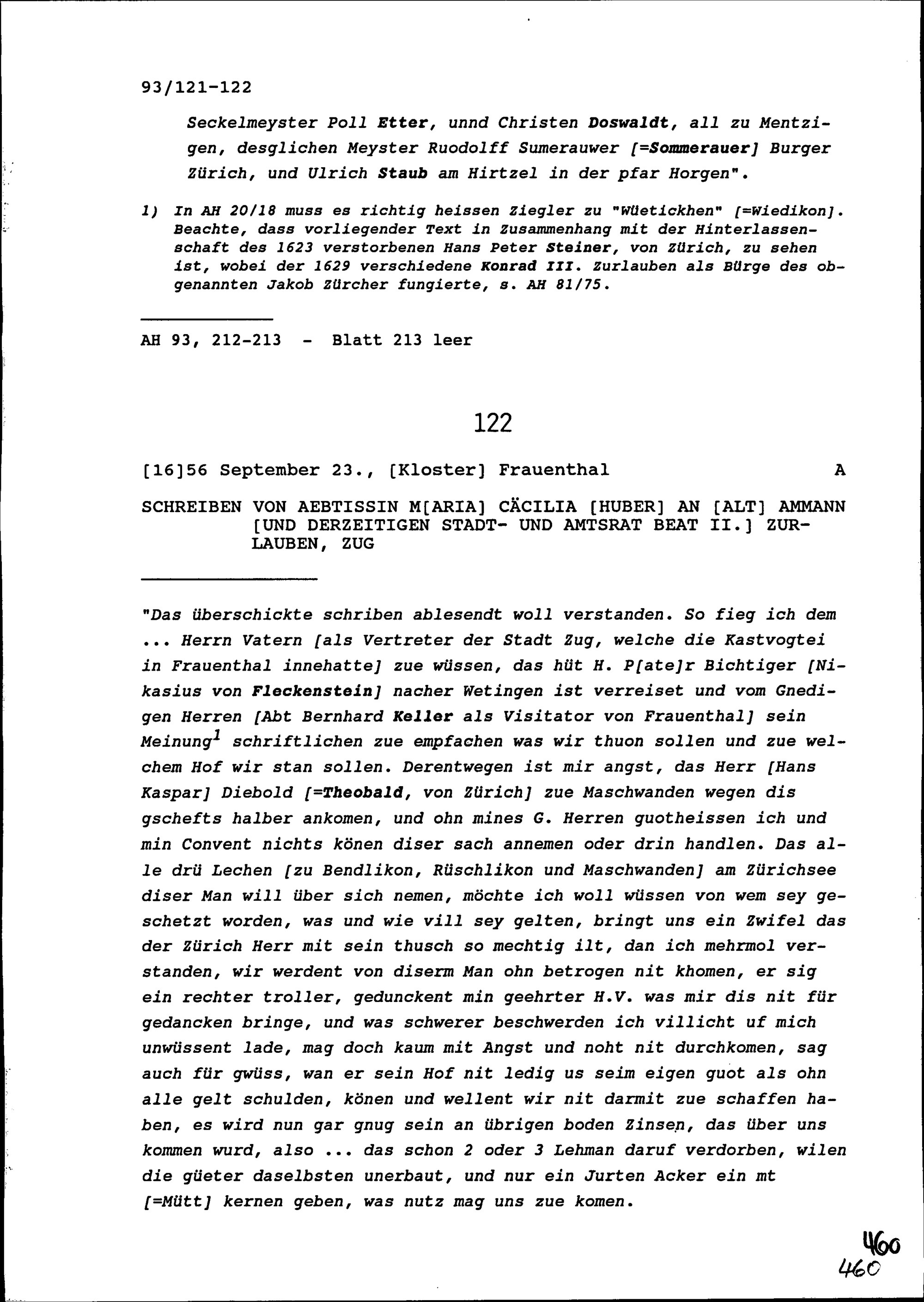 Schreiben von Maria Cäcilia Huber, Äbtissin, an Beat II. Zurlauben, Altammann und...