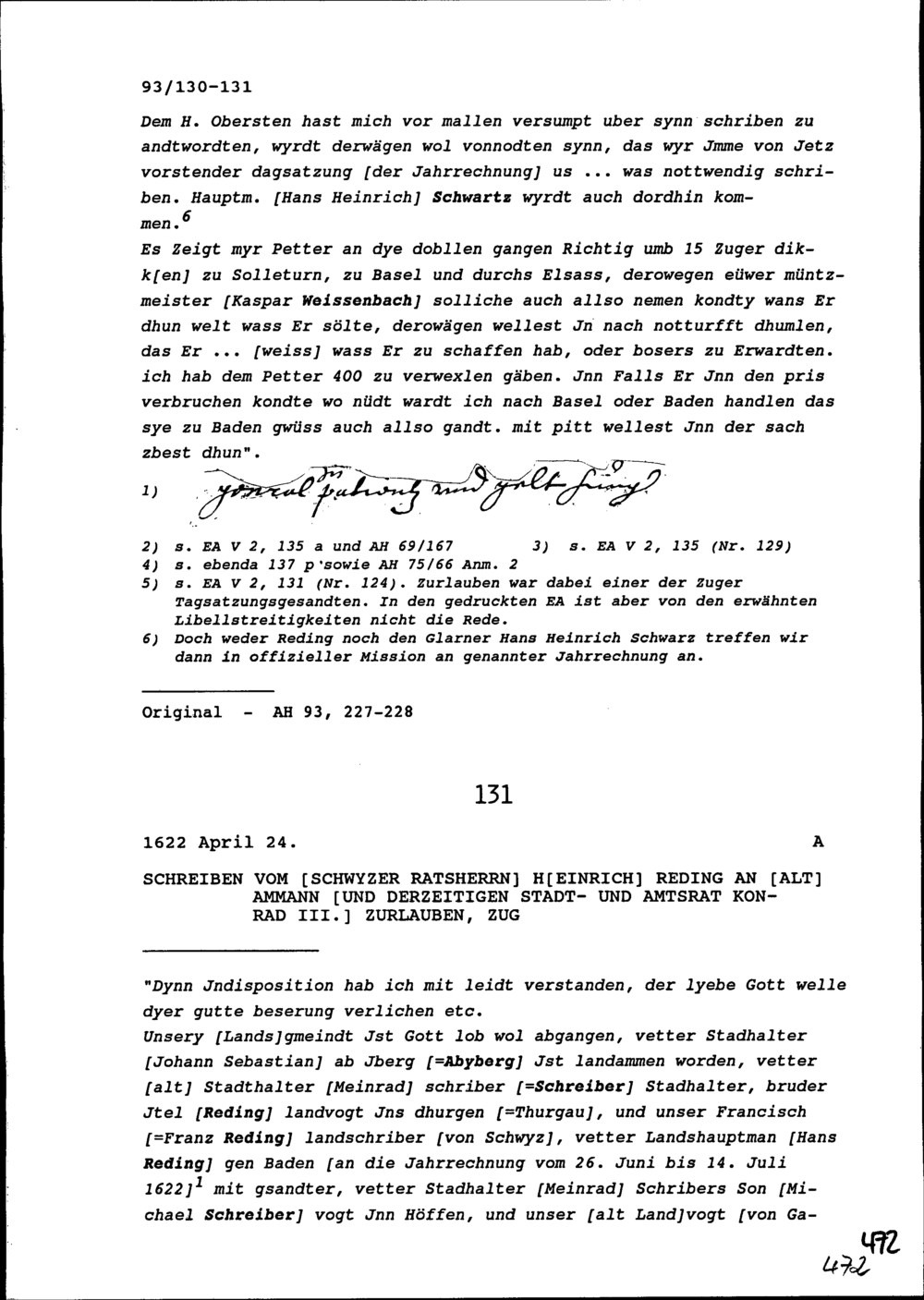 Schreiben von Heinrich Reding, Ratsherr Schwyz, an Konrad III. Zurlauben, Altammann und Stadt- und Amtrat, Zug