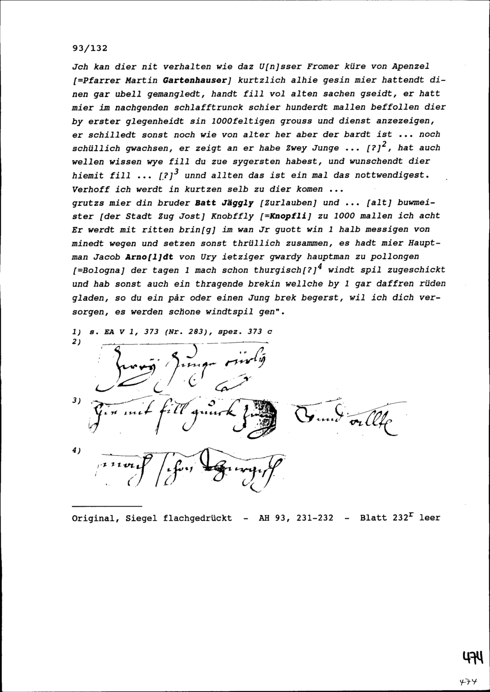 Schreiben von Heinrich Reding an Konrad III. Zurlauben, Stadtschreiber, Zug