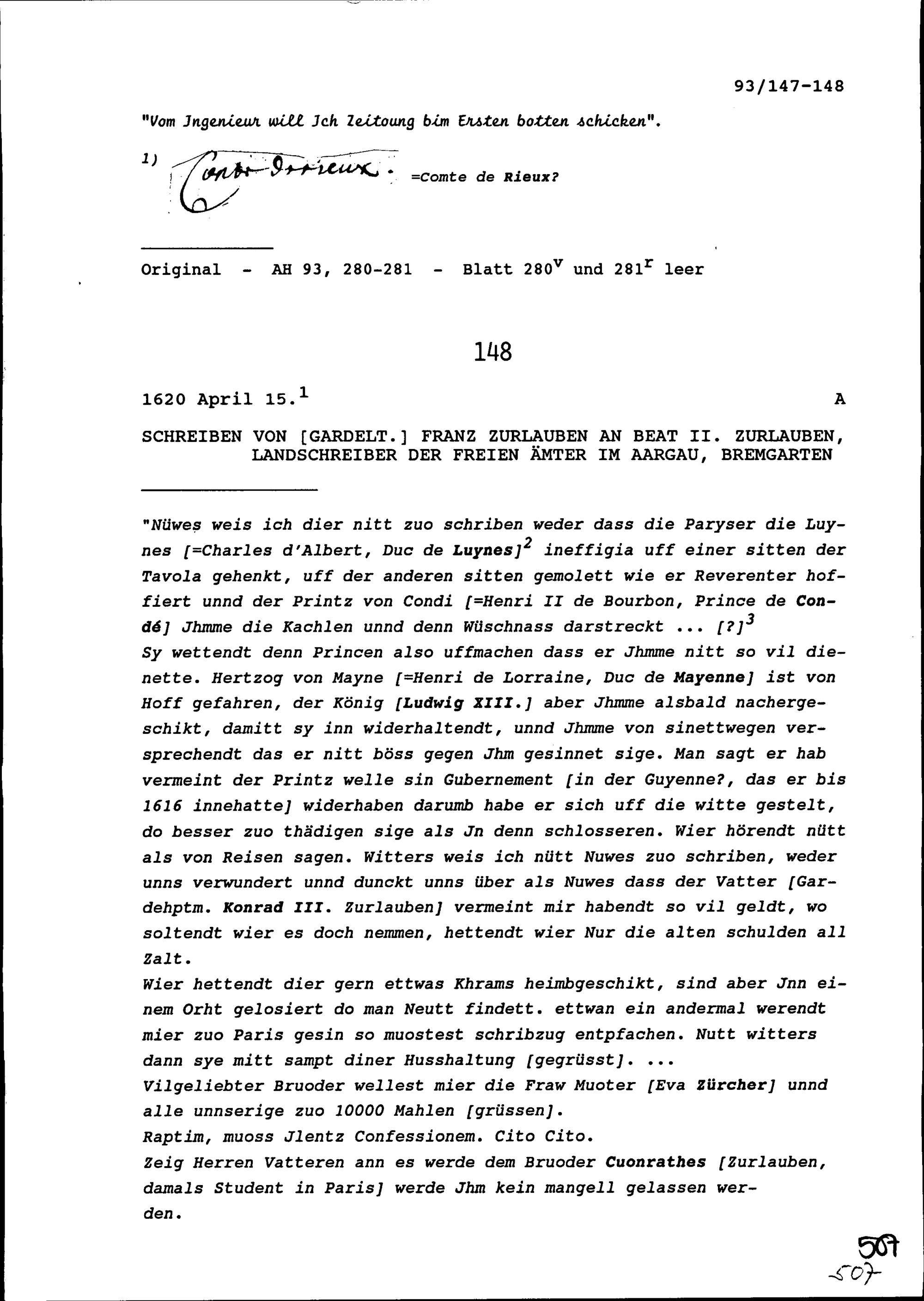 Schreiben von Franz Zurlauben, Gardeleutnant, an Beat II. Zurlauben, Landschreiber...