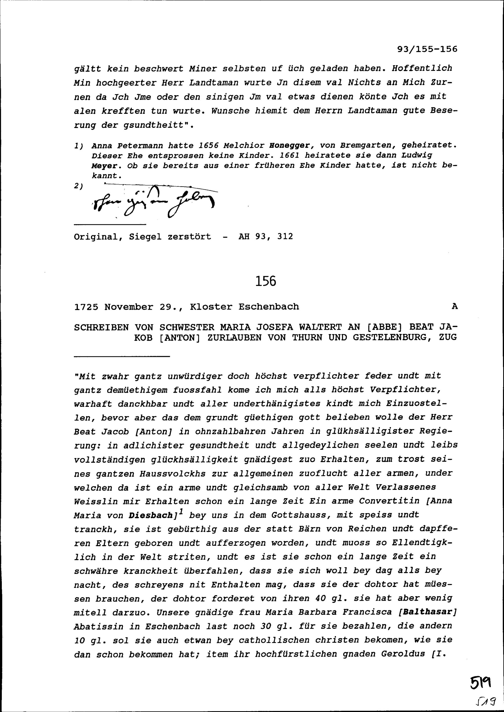 Schreiben von Maria Josefa Waltert, Klosterfrau, an Beat Jakob Anton Zurlauben, Priester, Zug